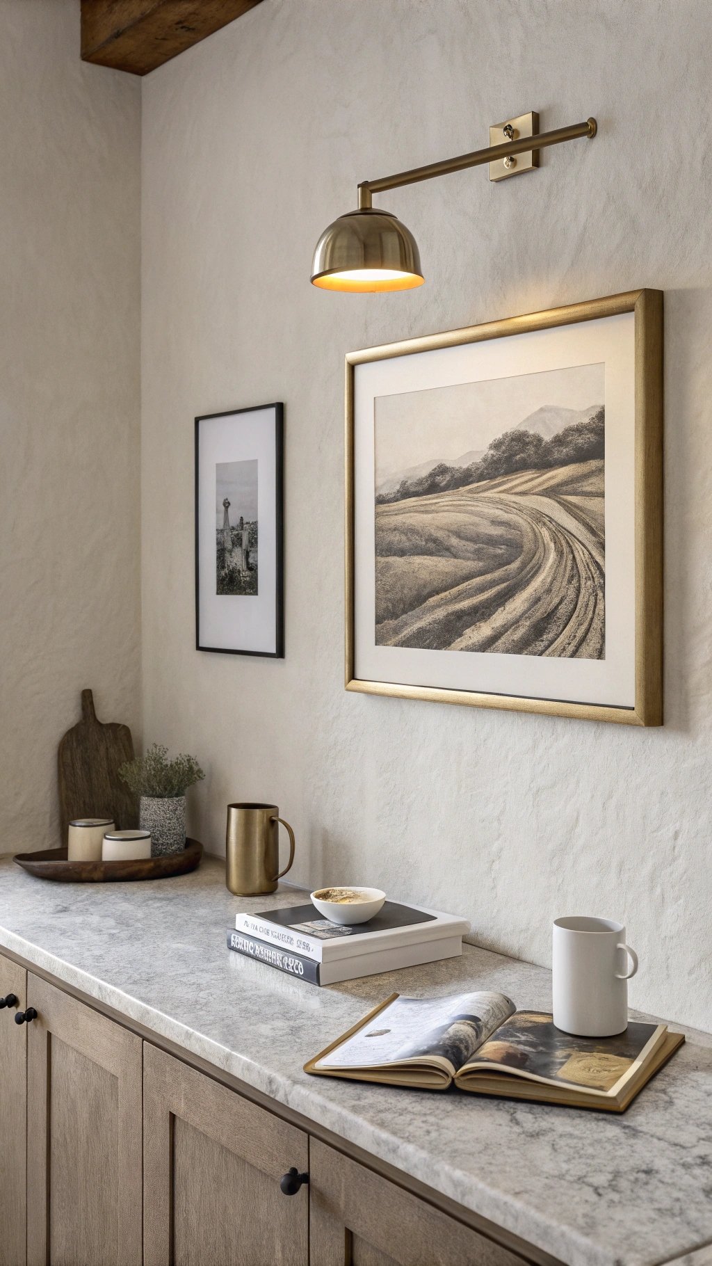 Add a slim picture light in a metal that matches hardware and echo one color from the artwork in a tiny accessory—linen shade, ceramic mug glaze.