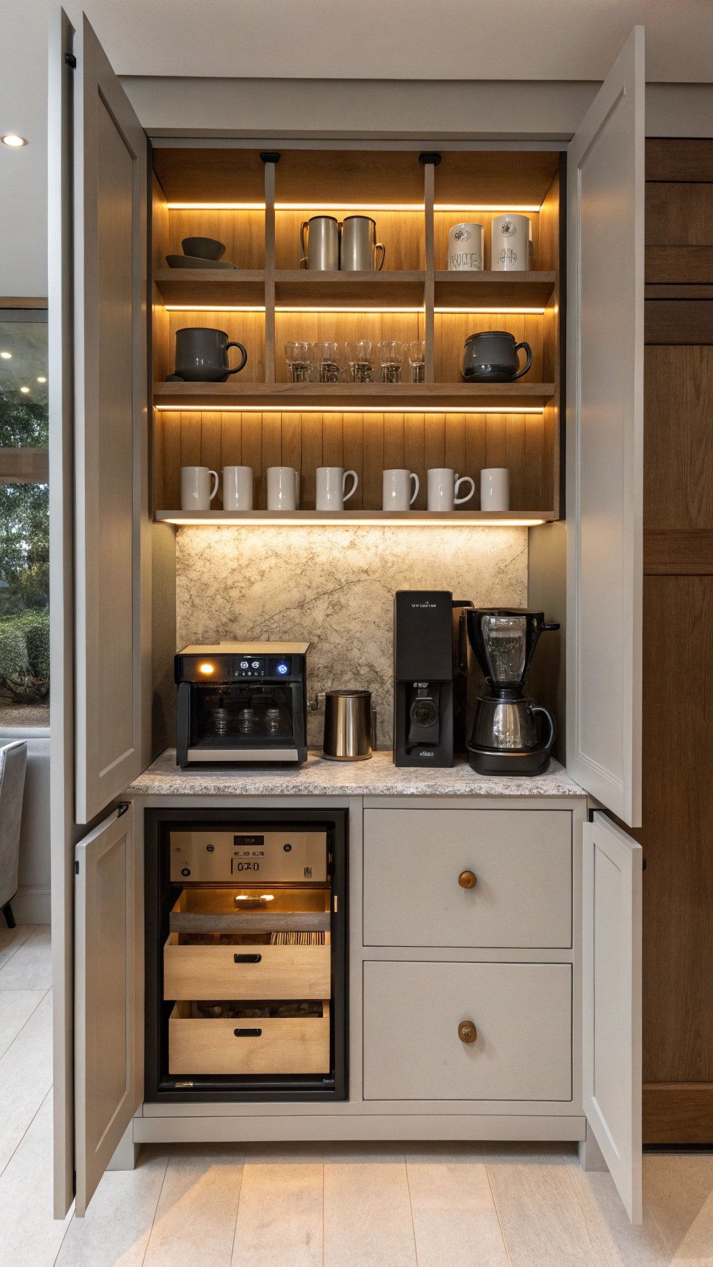 The reveal—open, brew, close—feels hotel-smart, keeps counters clear, and turns caffeine into quiet theater.