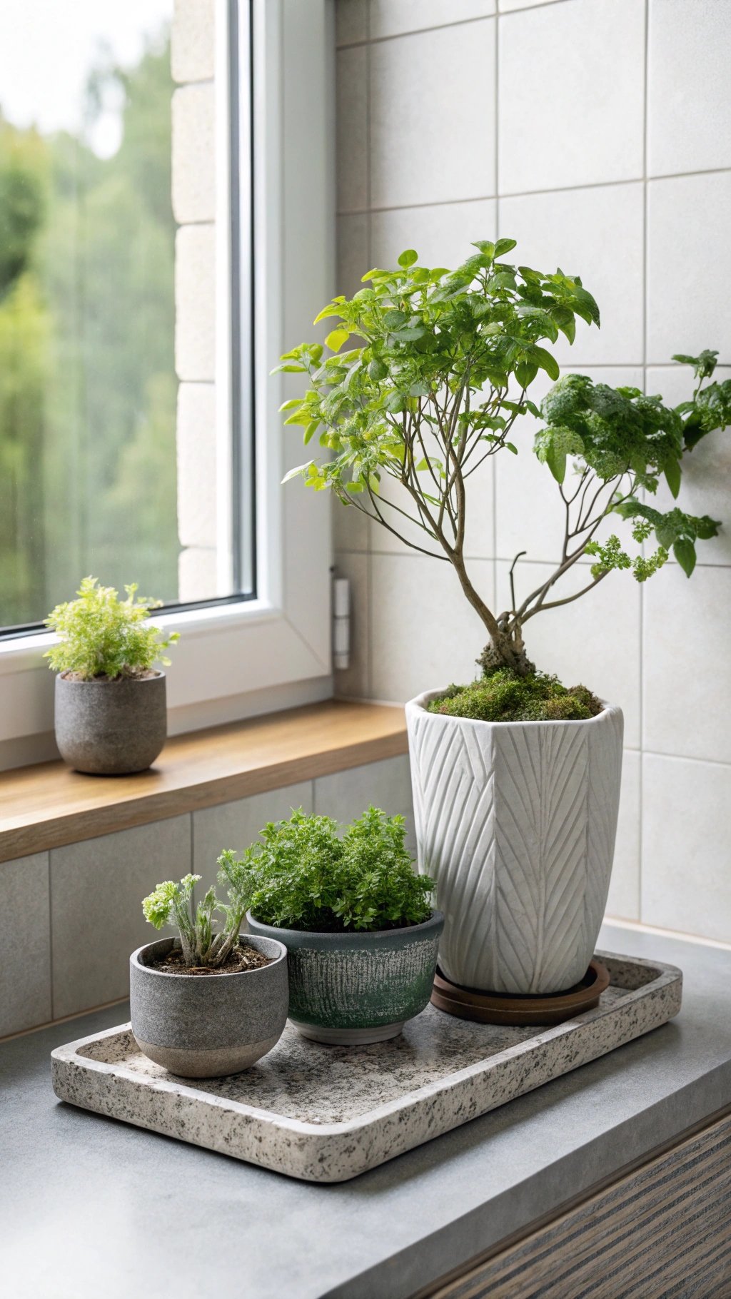 Set pots on a slim, water-resistant tray and add a tiny uplight on a timer for gentle evening drama. Use matte planters that echo the stone or cabinet tones so foliage remains the star.