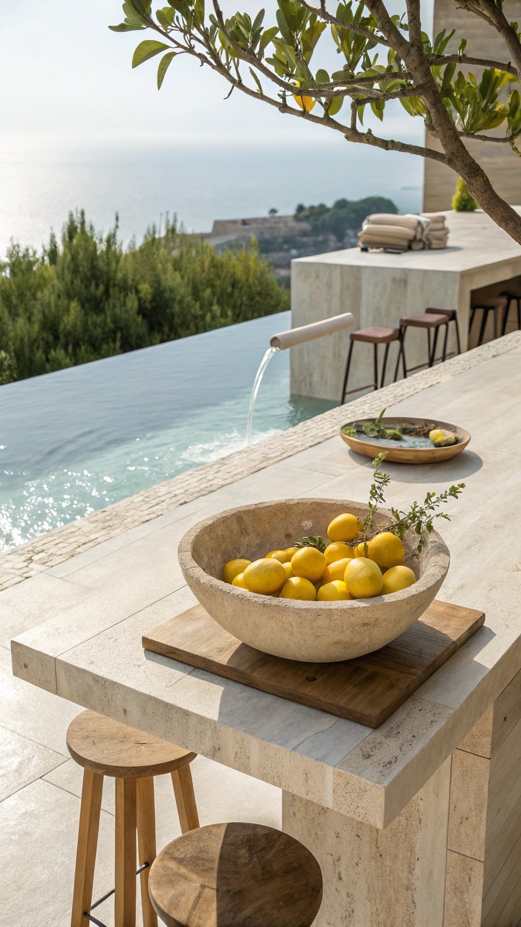 Coordinate the tray and bowl materials with fixed finishes—travertine with limestone, walnut with oak stools—so the vignette looks integrated, not floating.