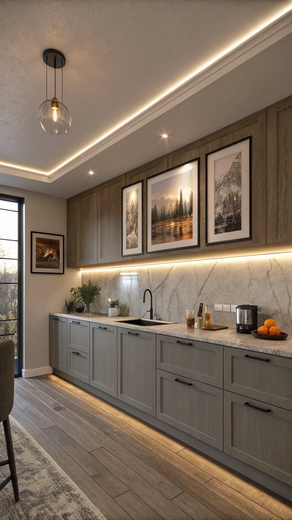 Rotate art twice a year for a mood reset without touching tile or paint. The gallery note elevates routine tasks and brings personality to rental or new-build kitchens.