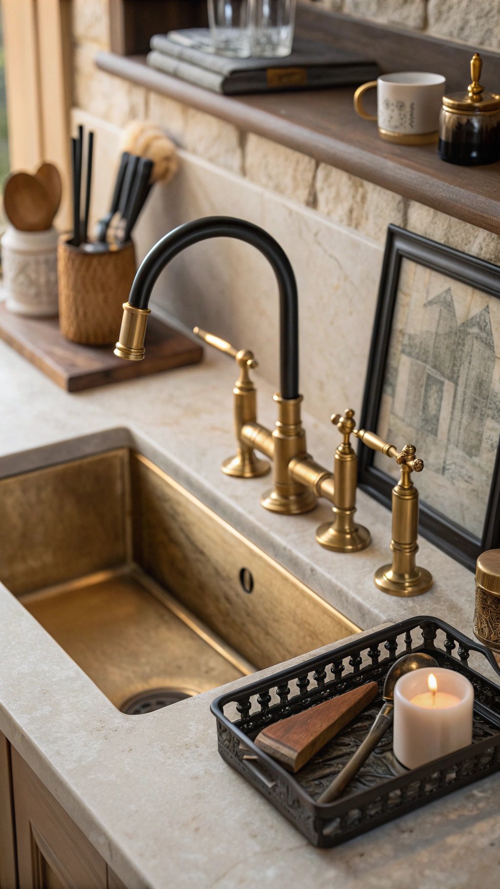 Keep finishes matte or satin so they glow, not glare. Repeat each metal at least twice—faucet and pulls, picture light and pot rail.