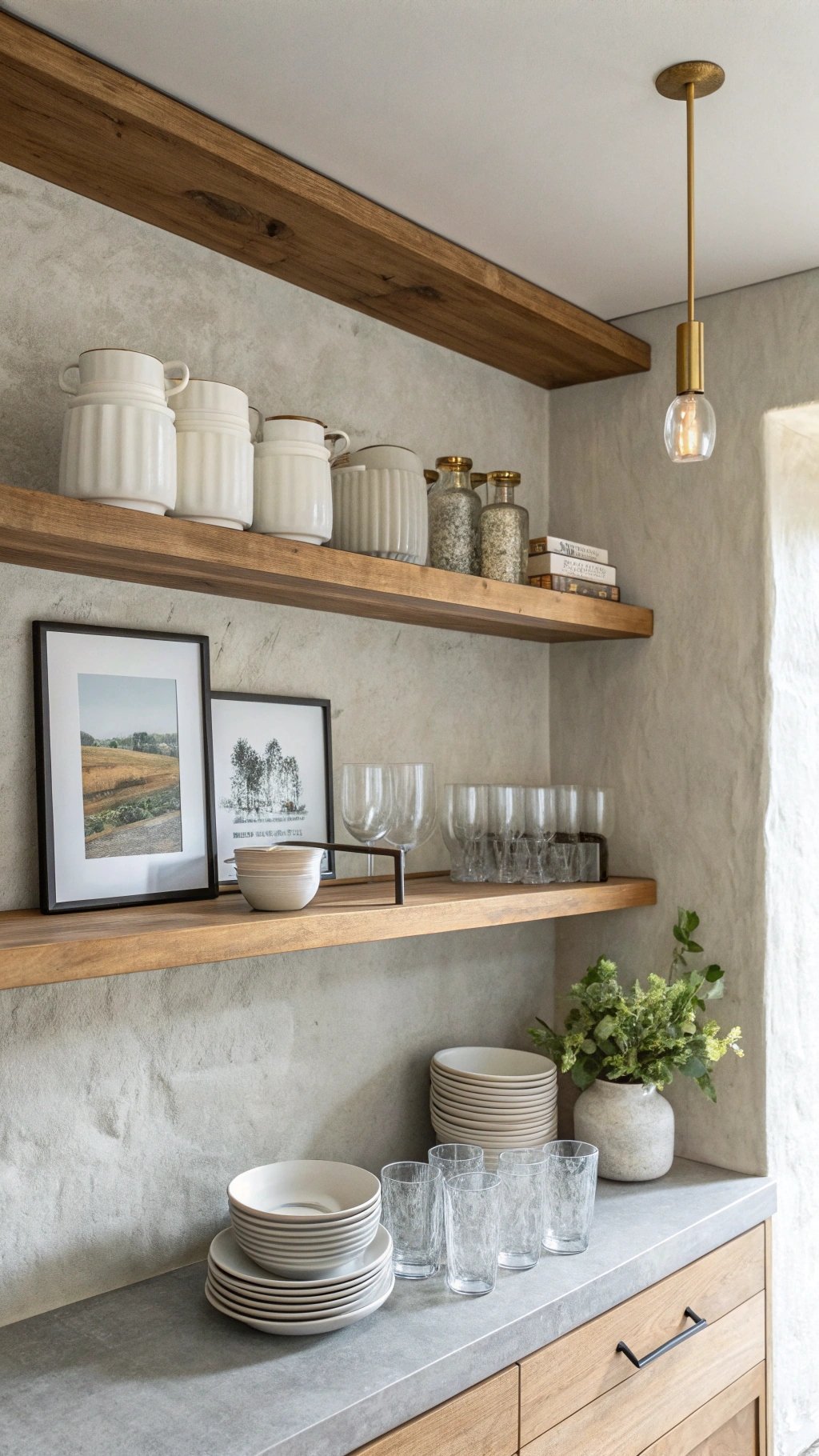 Paint the wall behind shelves in washable satin or microcement for steam resistance, then add a petite picture light above a single framed print.