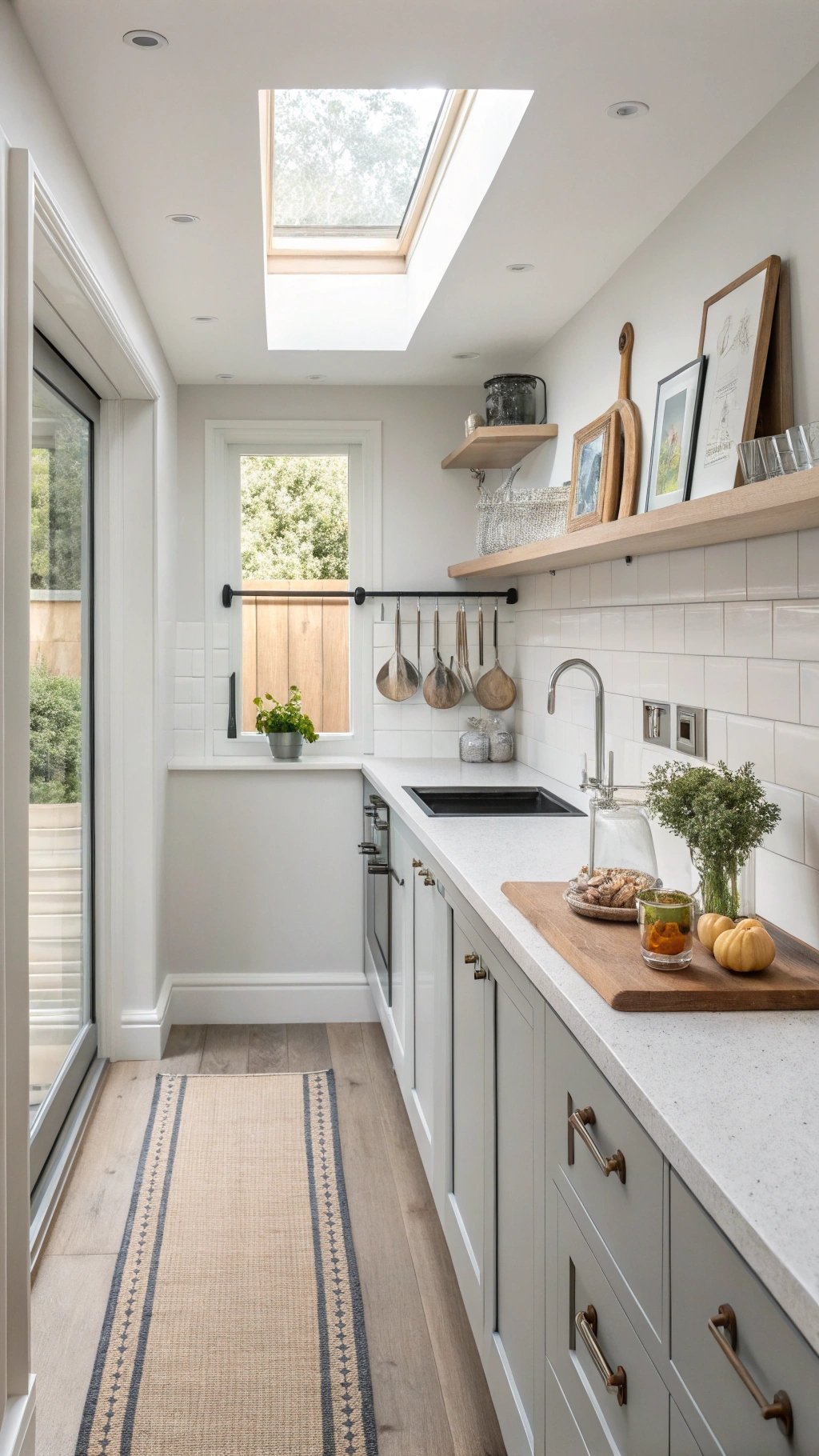 In compact rooms, decor must earn its keep. Swap bulky centerpieces for a single long board, use wall-mounted rails for pretty everyday tools, and keep a mirror or back-painted glass backsplash to bounce light. A narrow runner anchors the galley visually and softens footsteps.