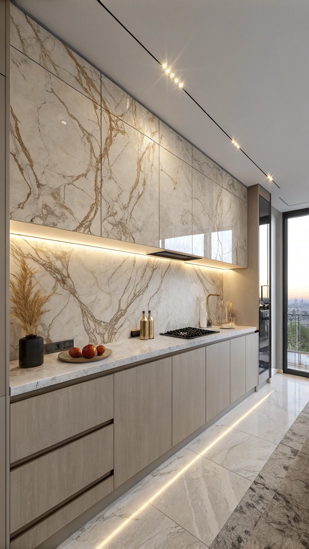 Keep counters edited—oil, salt, and one cutting board—so the surface reads as art. Color-match outlets to the wall to avoid visual interruptions and let veining or tile pattern do the talking.