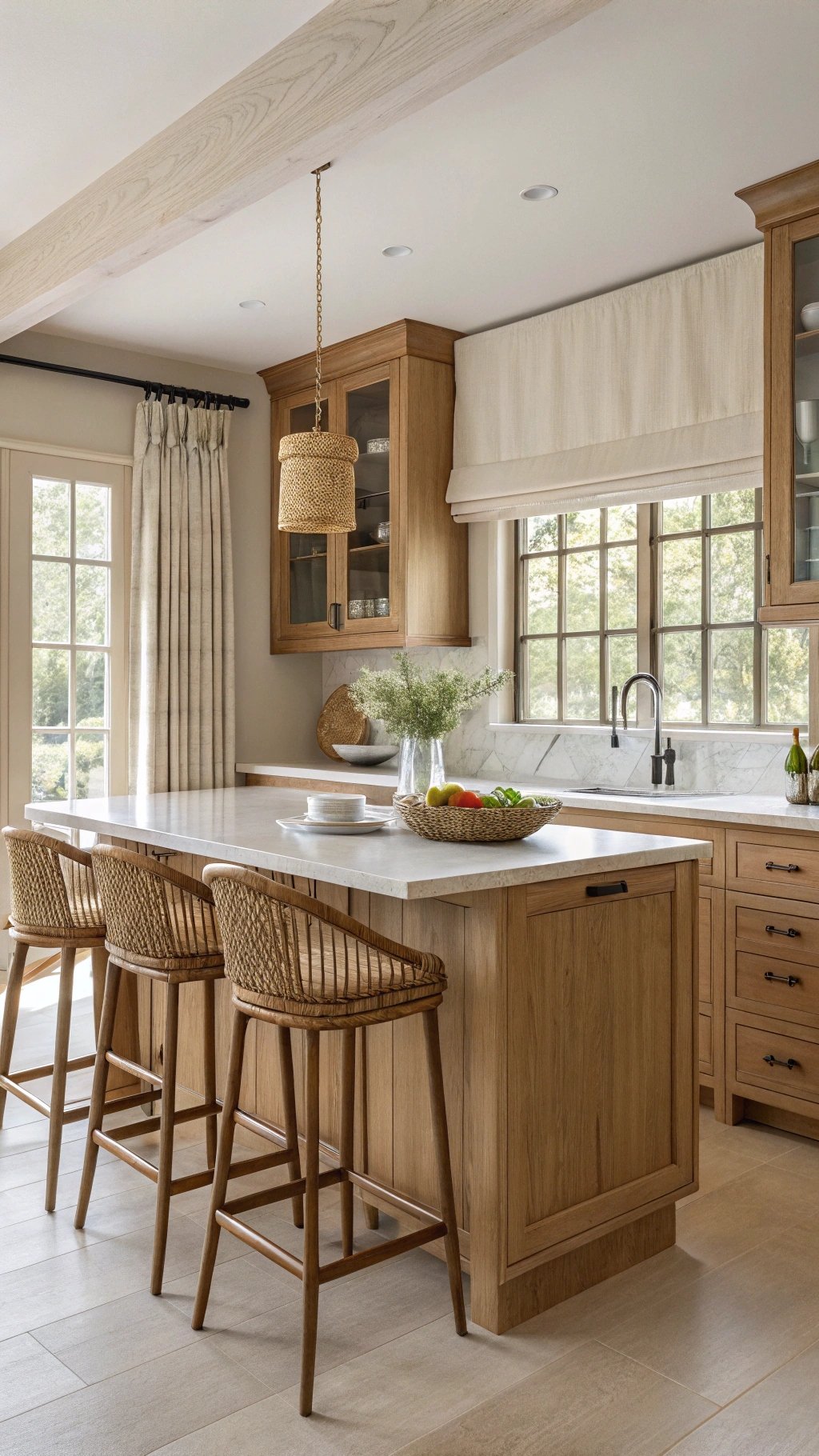 Natural materials bridge modern fixtures and everyday life. Rift-cut oak fronts, walnut cutting boards, cane stools, and linen runners add tactile warmth that ages gracefully.