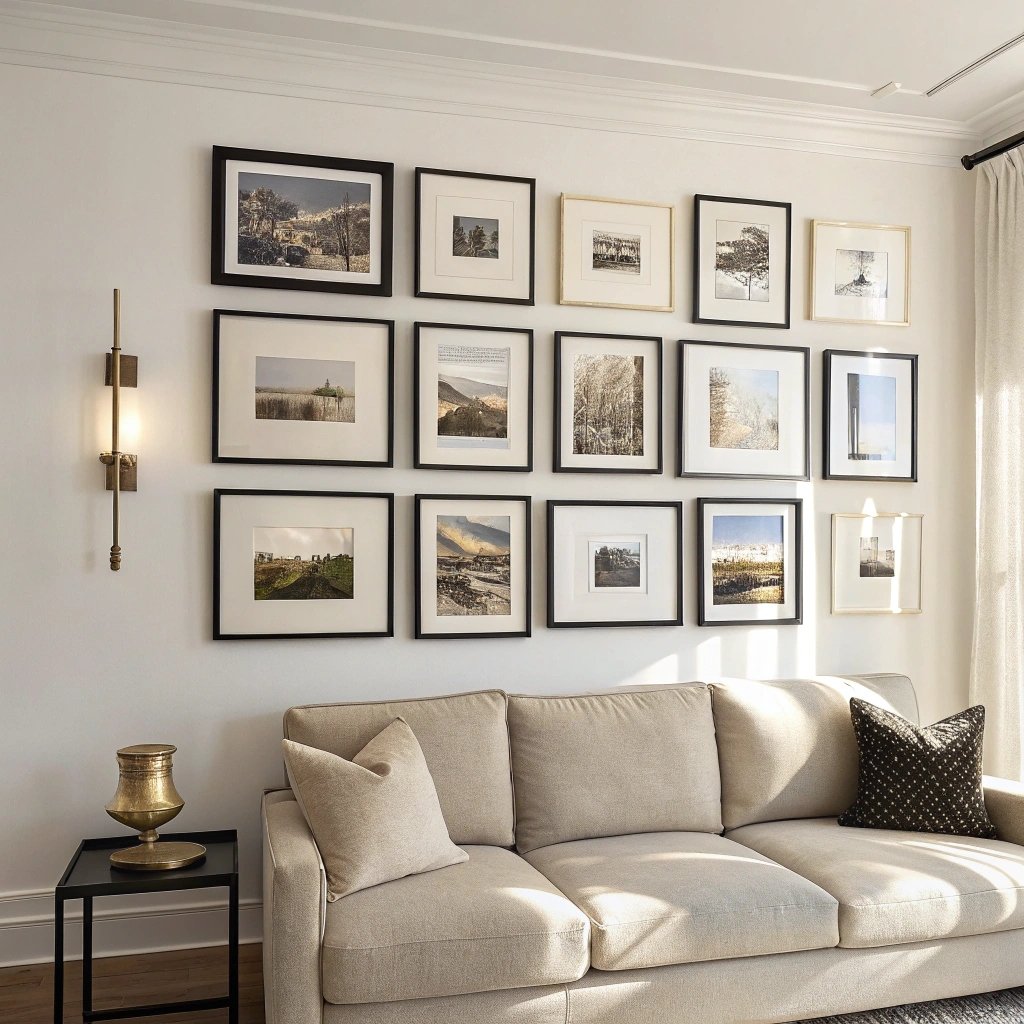 Turn a blank wall into a personality piece with a tight, cohesive gallery. Mix sizes, keep frames slim and consistent, and align a strong centerline.