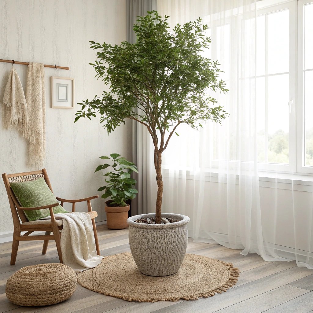 One or two substantial plants—olive tree, ficus, or rubber plant—soften edges and introduce organic movement.