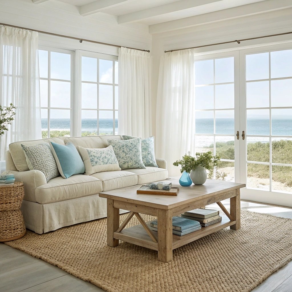 Channel light and air without clichés. Use sand-toned linens, bleached oak, woven seagrass, and chalky ceramics.