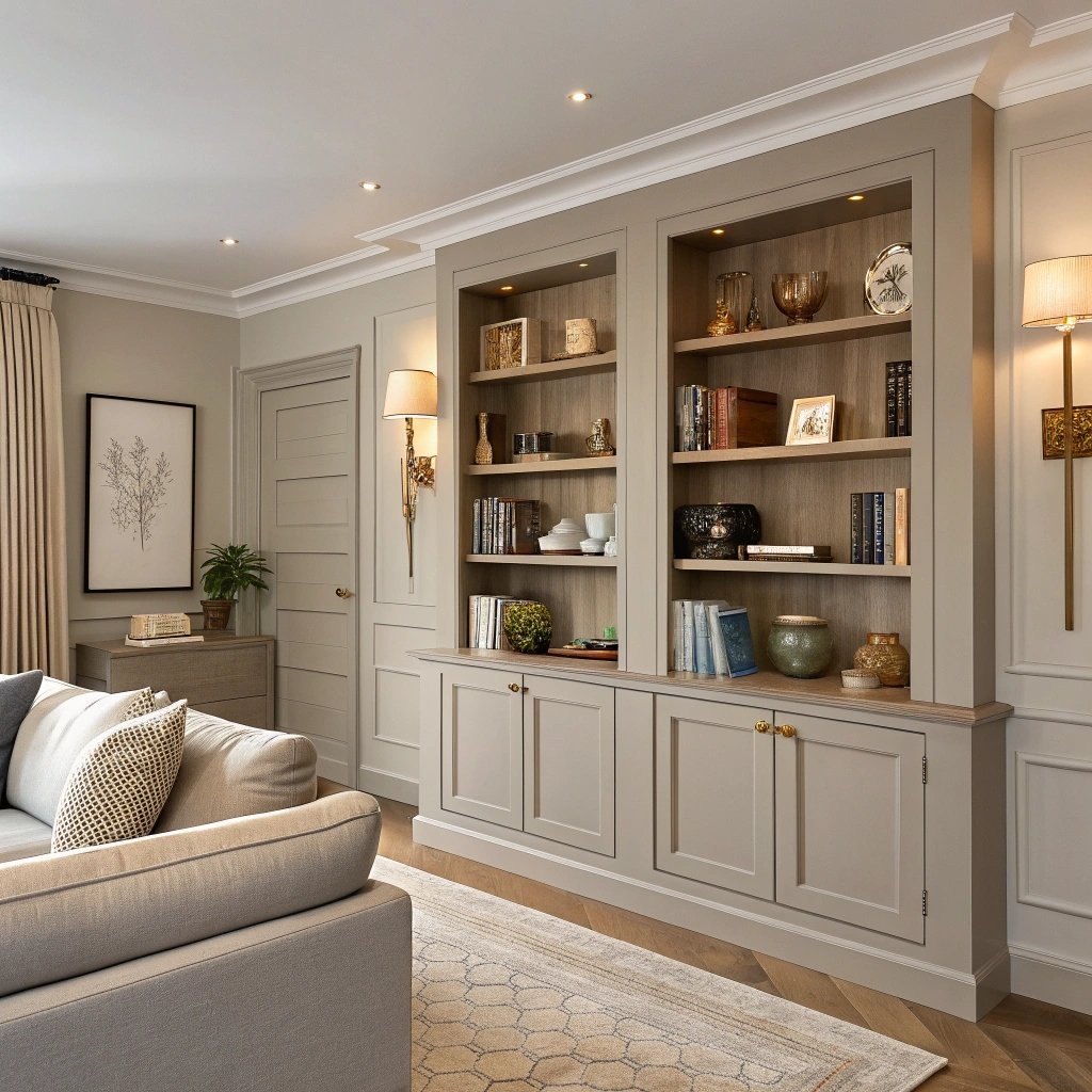 Floor-to-ceiling built-ins add storage and personality. Paint them to match the walls so they read architectural, not bulky, and style shelves with generous negative space.
