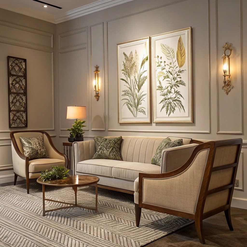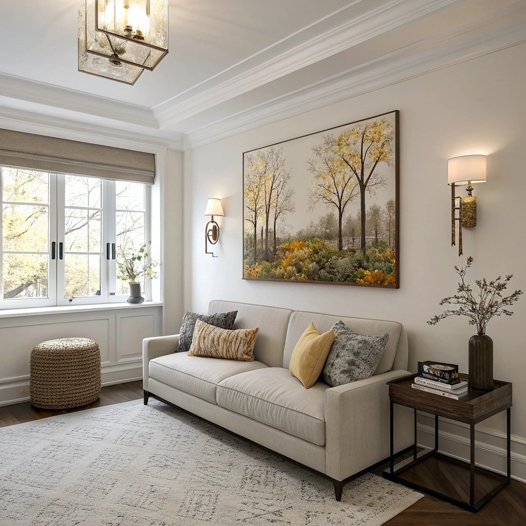 Keep art small and near the seating line so the visual weight stays grounded. This arrangement works wonders in rooms with low ceilings or awkward windows.