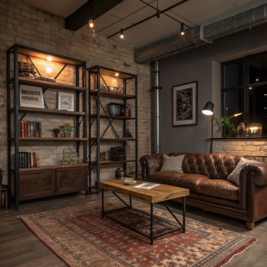 Balance workhorse materials with warmth: black steel, aged leather, concrete or plaster, and reclaimed wood. Keep silhouettes clean and let patina speak.
