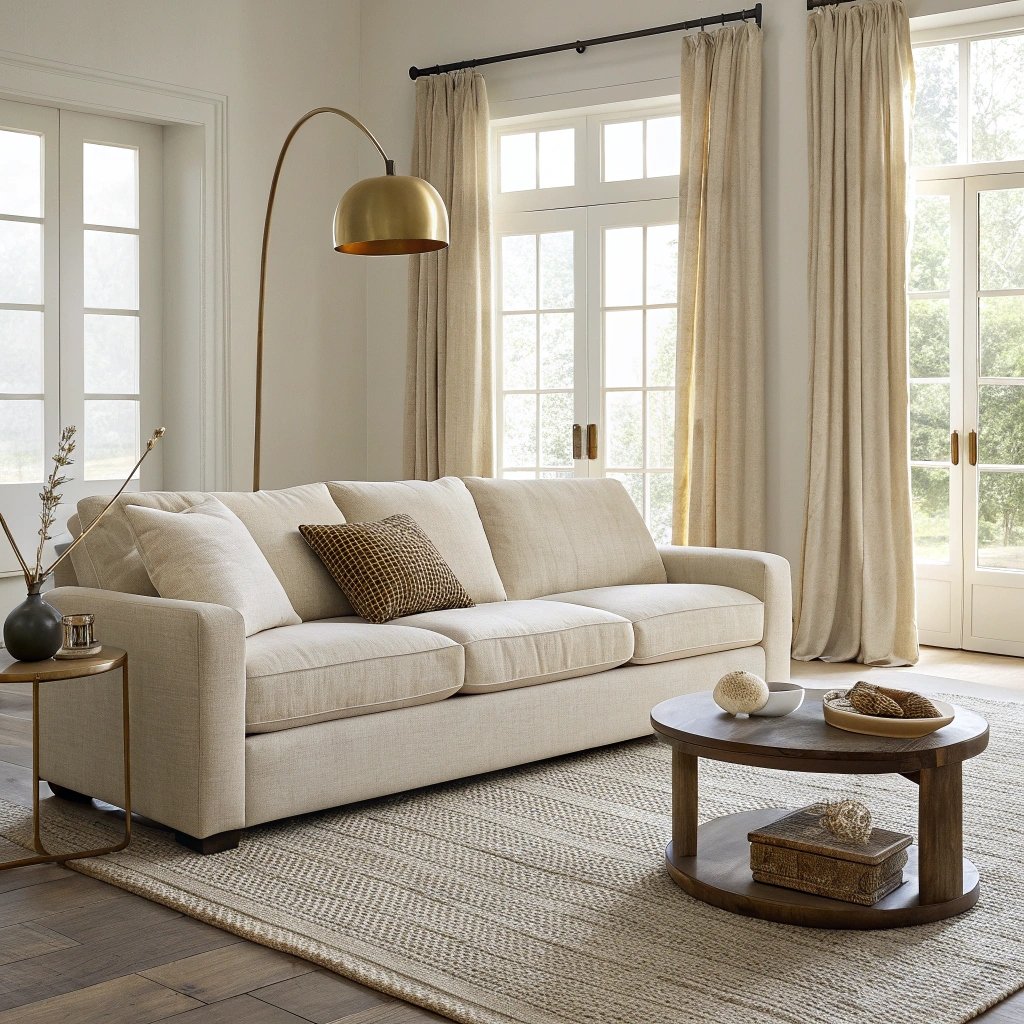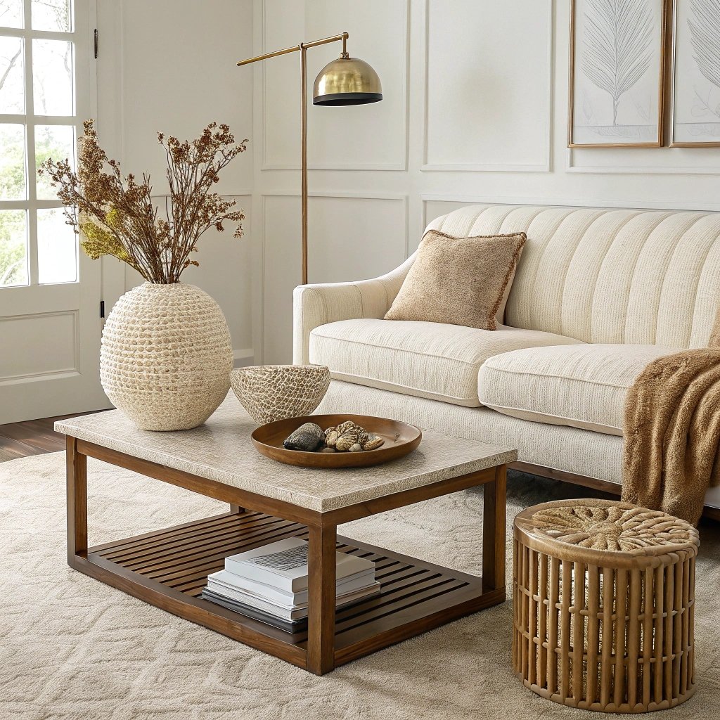 Texture makes neutrals interesting. Combine a bouclé or chenille sofa, oak or walnut tables, and a travertine or limestone top.