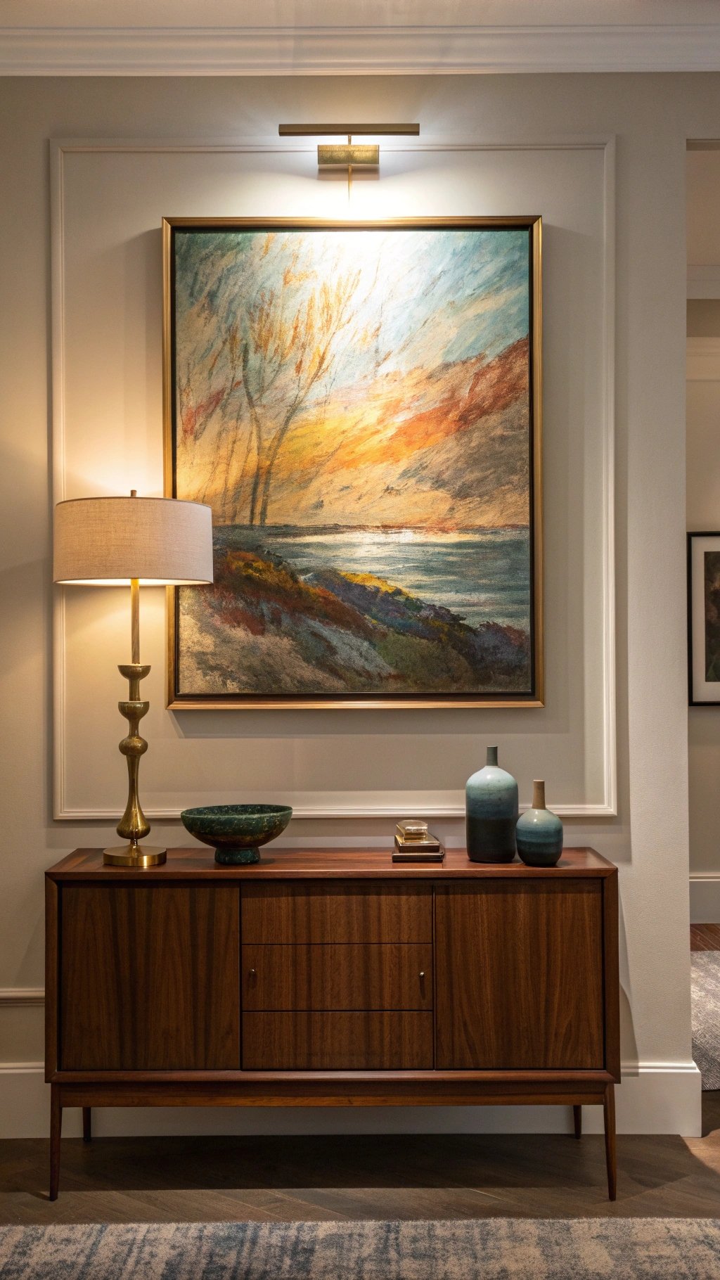 Color-pick a tiny hue from the art and repeat it once in a vessel or pillow piping. Add a brass picture light for evening glow. The intentional echo creates a gallery feel that’s warm, not precious.