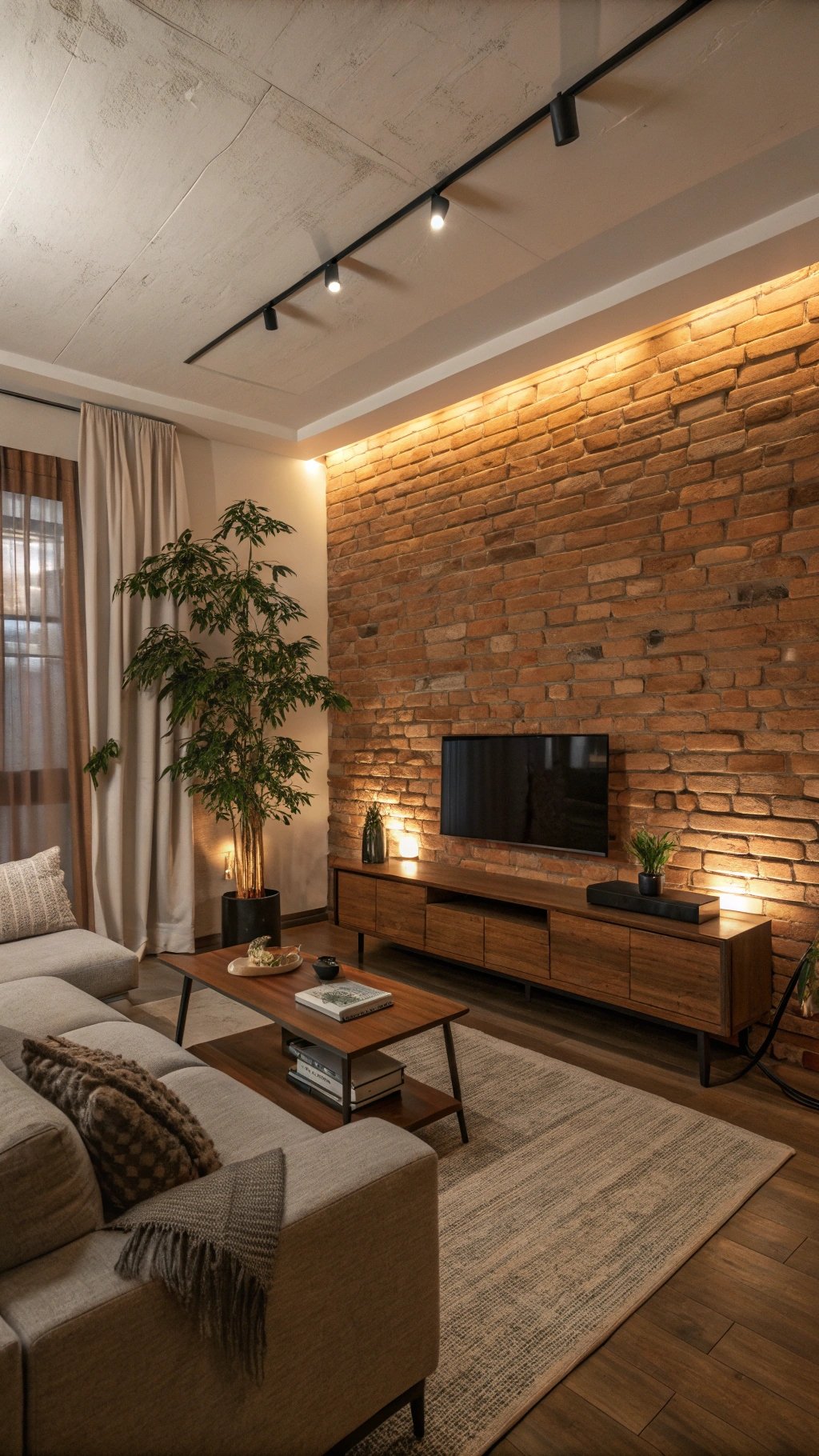 A single texture wall—exposed brick, breeze block screen, or stacked stone—grounds sleek furniture. Keep the rest of the envelope pared back so the material can breathe.
