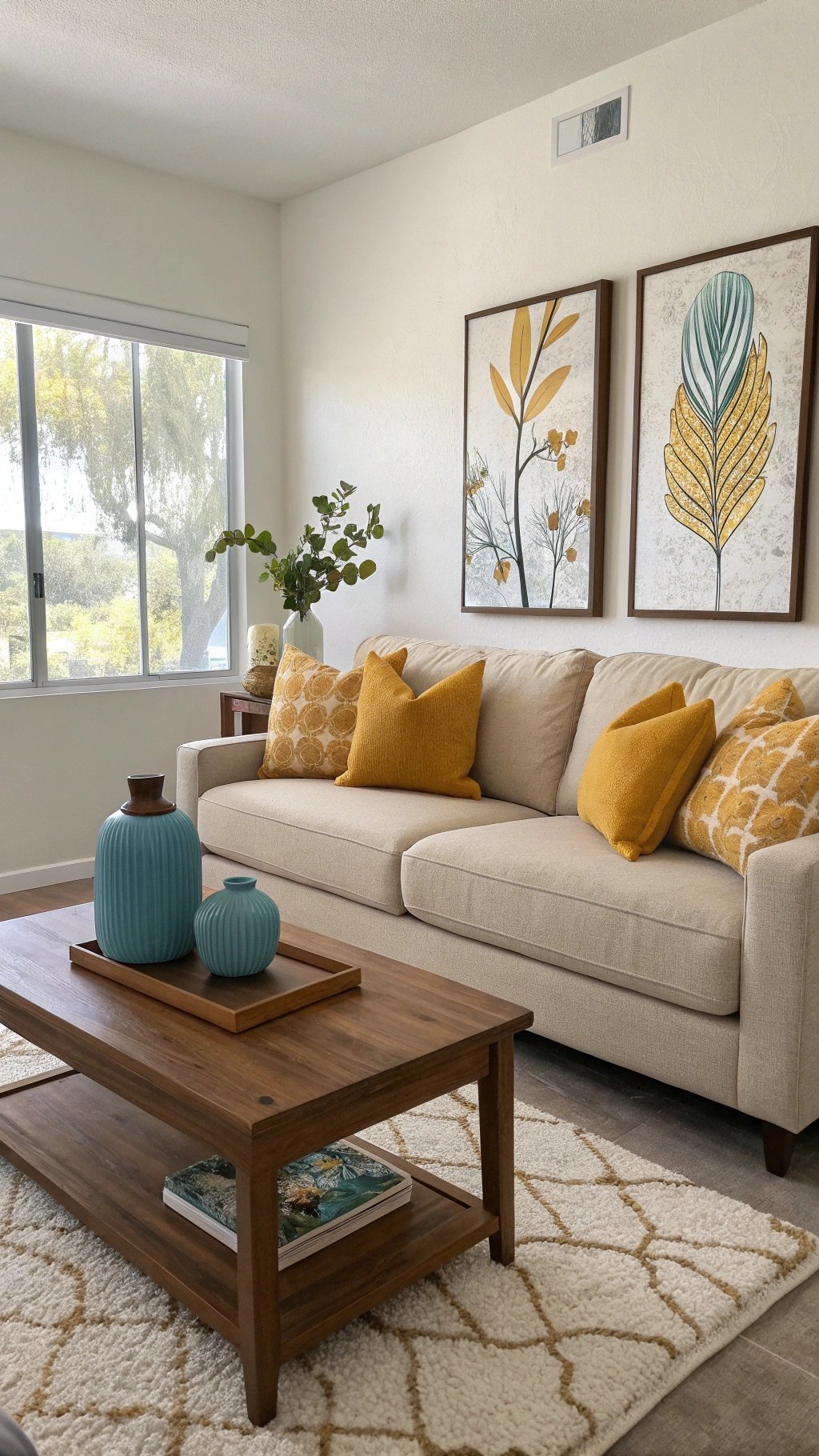 Work neutrals plus one saturated pop—mustard, teal, tomato red, or avocado. Keep the pop in movable pieces: cushions, a lacquer tray, or a ceramic lamp.