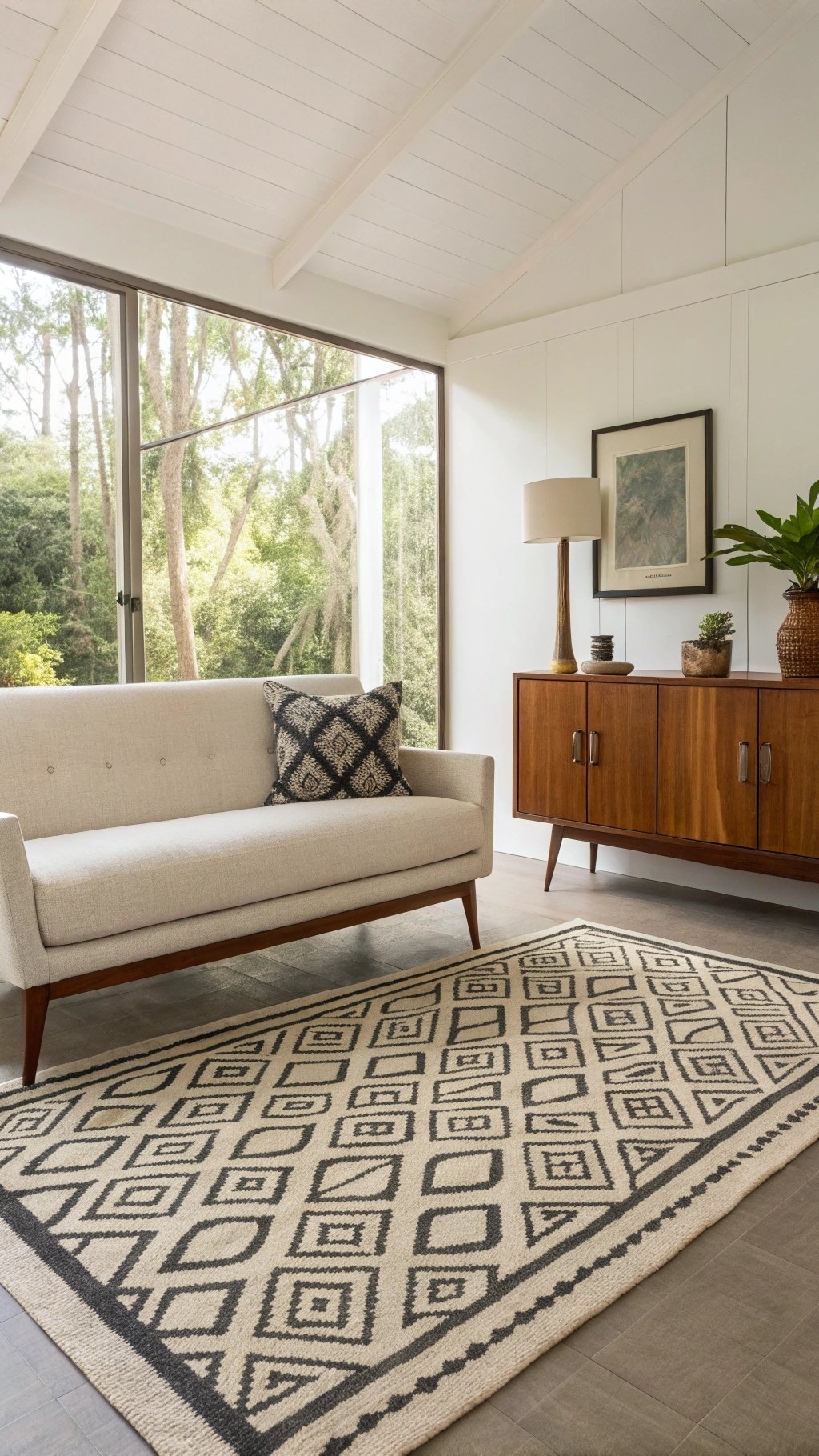 Introduce pattern through a flatweave rug or upholstery with era-true motifs—atomic dots, chevrons, or grid lines.