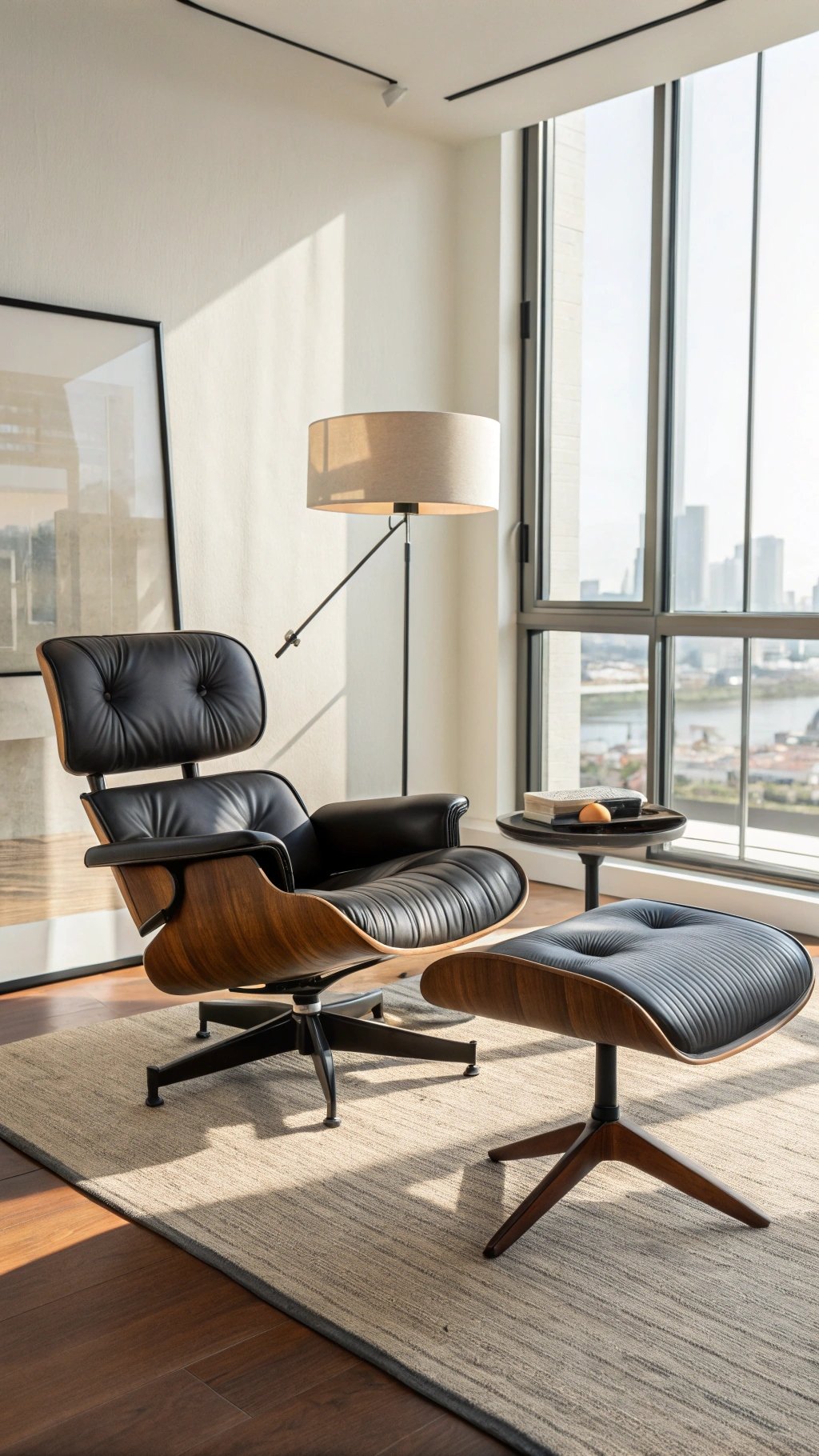 Bring in one hero lounge chair—Eames Lounge, Womb, or a walnut scoop chair. Place it where light hits naturally for reading.