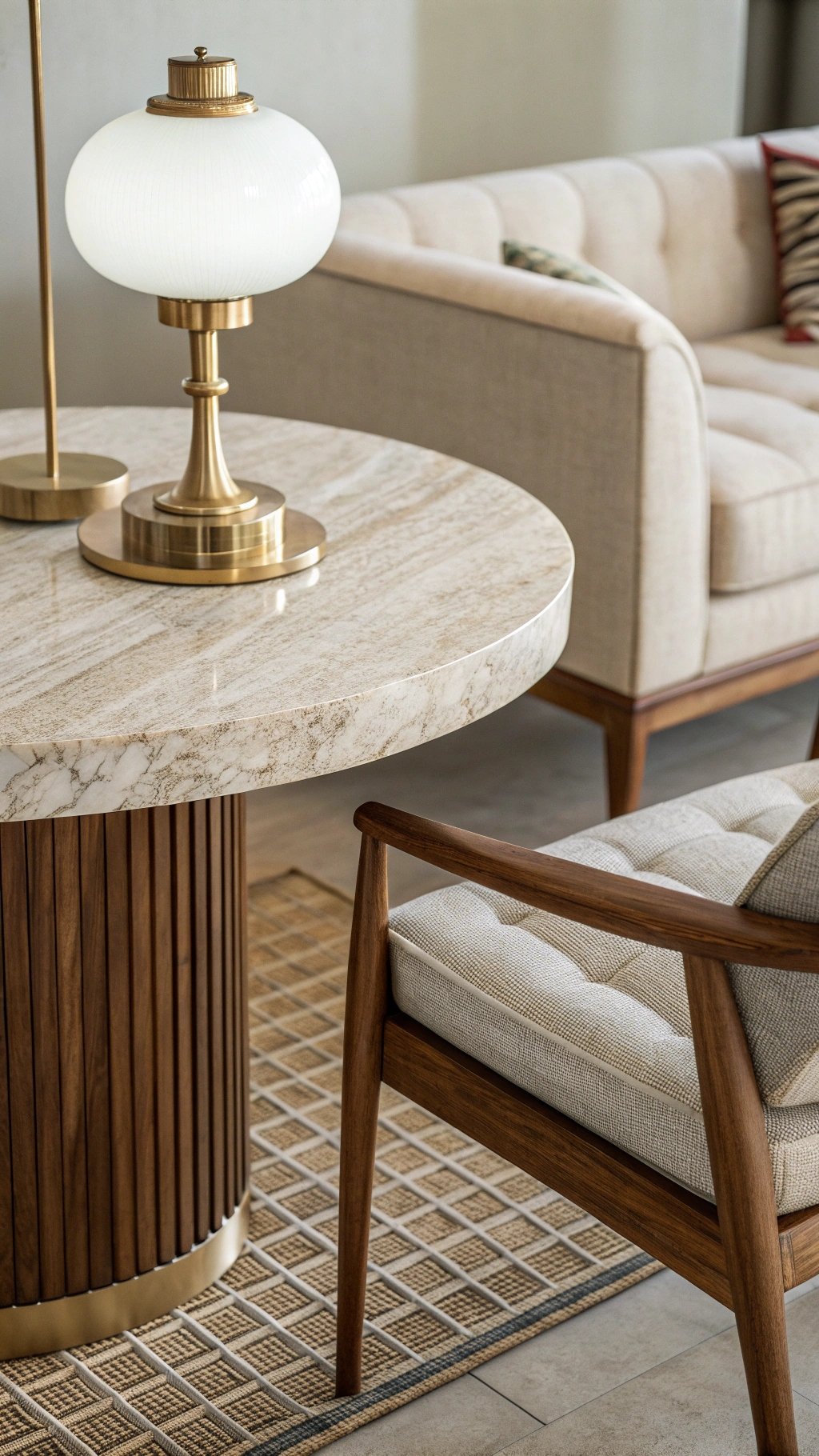 Echo each material twice—stone coffee table and stone bowl, brass lamp and brass picture light, walnut chair and walnut frames—so the room feels intentionally layered. It’s a grown-up way to honor mid-century’s material honesty.