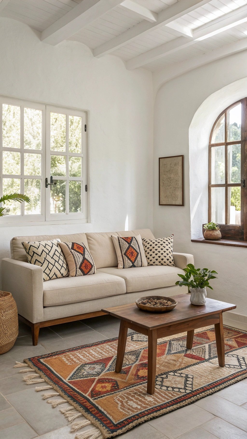 Place pattern at the floor and keep upper planes quieter for visual balance. Echo one motif on a single lumbar pillow or a small framed textile.