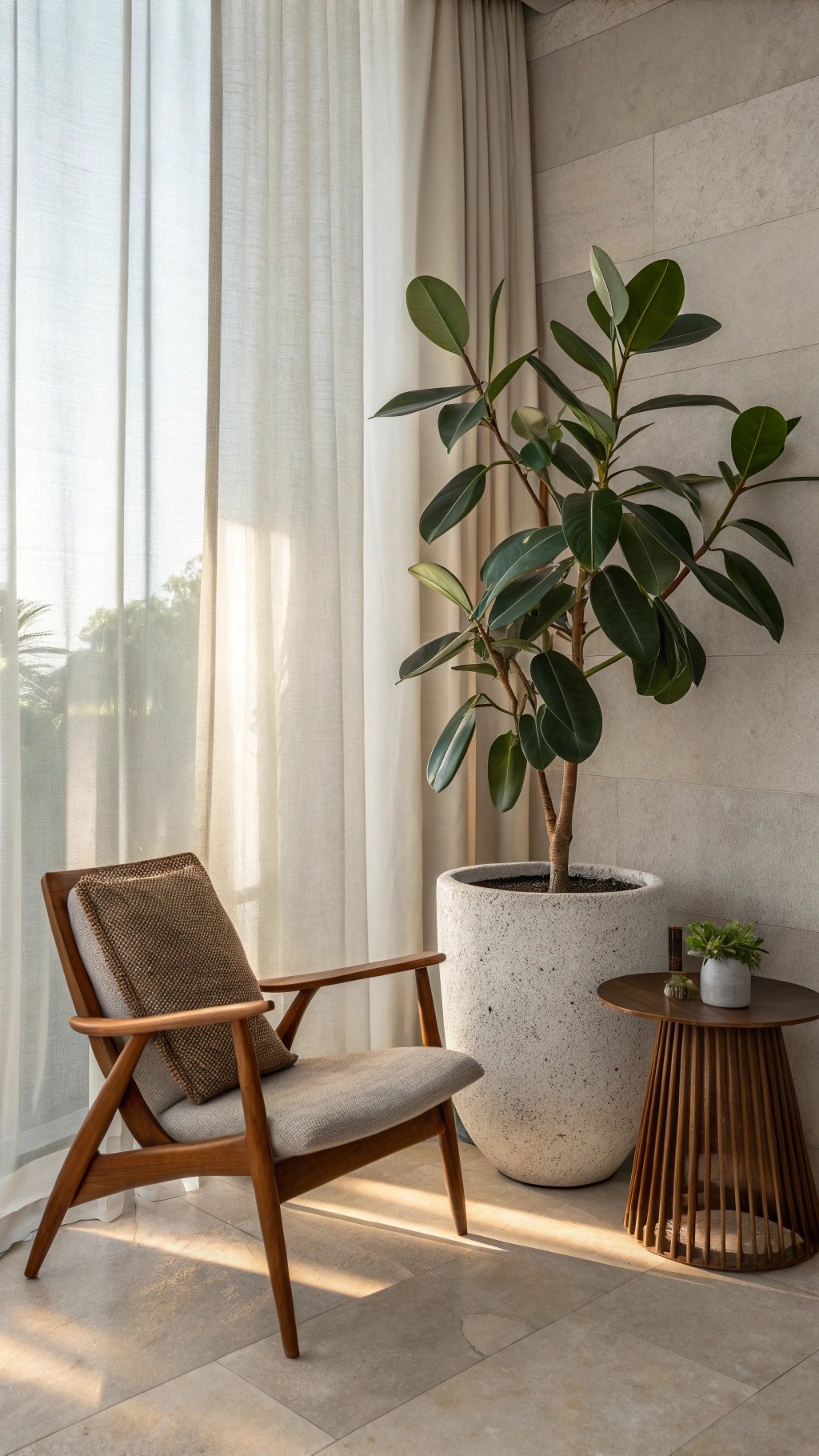 Choose structured foliage—rubber plant, fiddle-leaf fig, or olive tree—in a matte ceramic or fiberstone planter. One or two large plants beat many small pots, keeping sightlines calm and shapes sculptural.