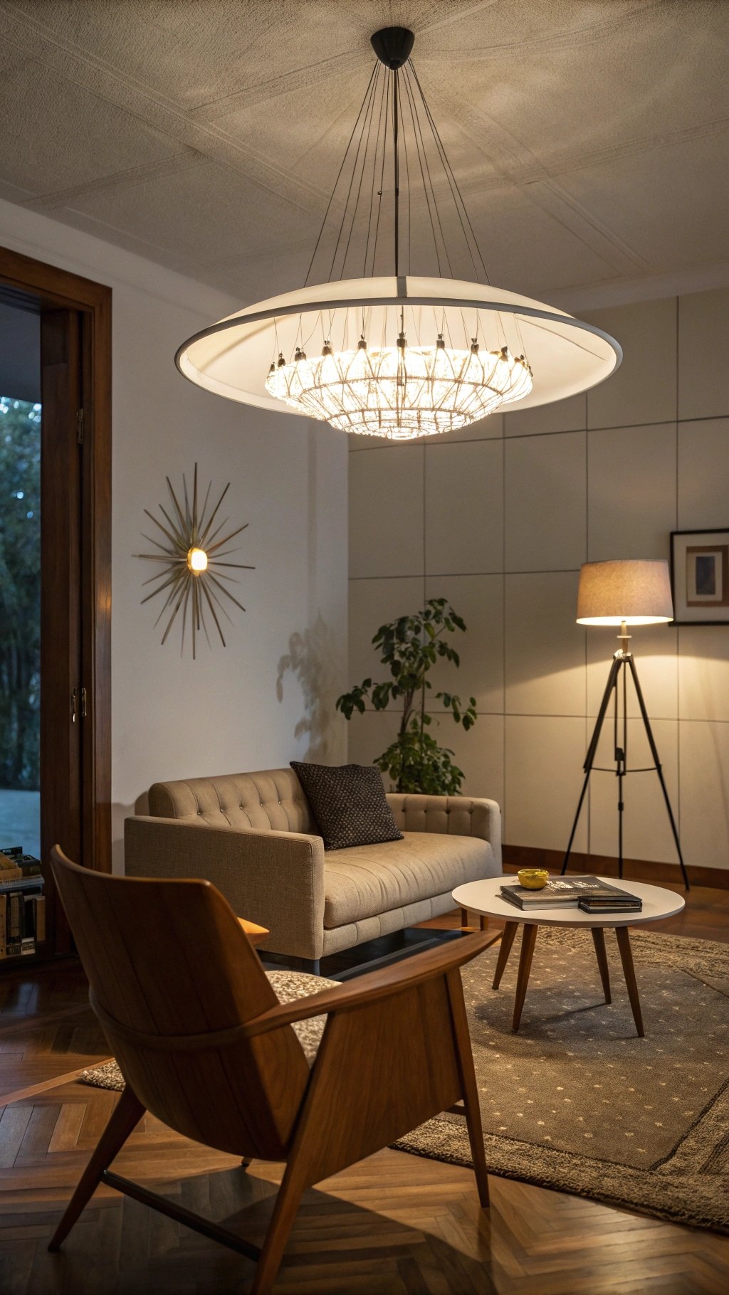 Lighting is jewelry in a mid-century room. A Saucer pendant or Sputnik chandelier instantly sets the tone, supported by a tripod floor lamp and petite table lamps.