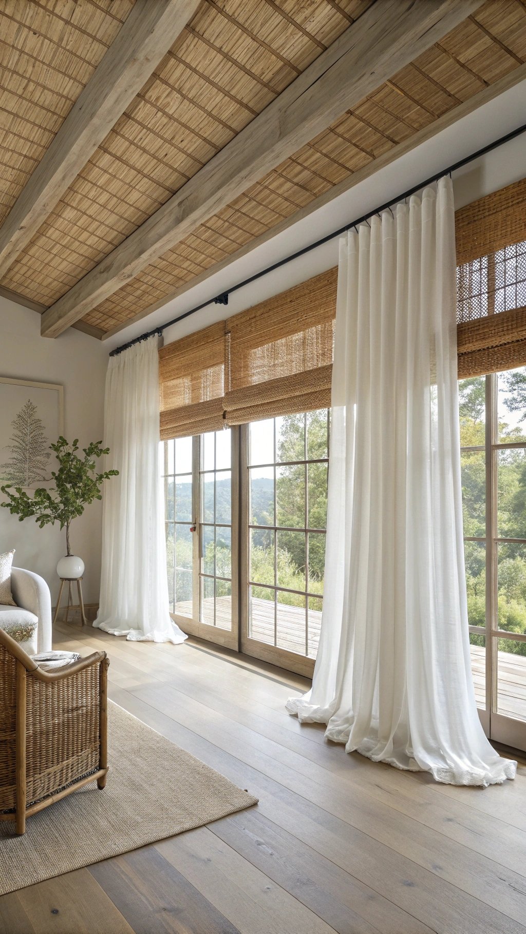 Match drapery tone to wall color for a seamless vertical plane, then add a darker woven shade inside the frame for contrast. Layers control glare while honoring the architecture—true to the era’s indoor-outdoor mindset.