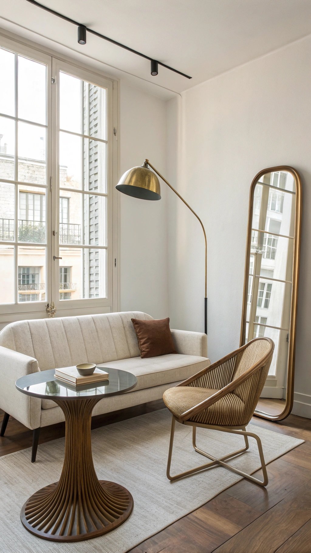 Scale down without losing character: a 72–78″ sofa, petite boomerang table, and armless slipper chair keep circulation open. Mirrors opposite windows widen the view; a single oversized artwork keeps focus tight.