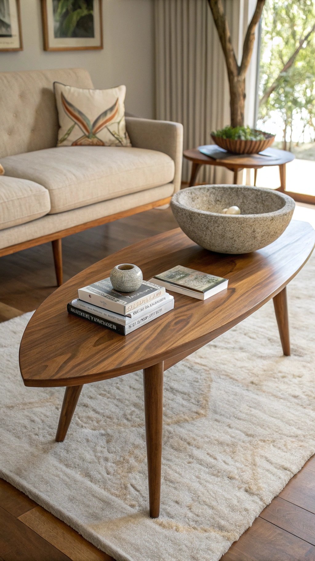 Choose a table with visible edge detail and tapered legs, then keep tabletop styling low—one stone bowl and two books—to honor the silhouette. The negative space around the curved form becomes part of the room’s rhythm.