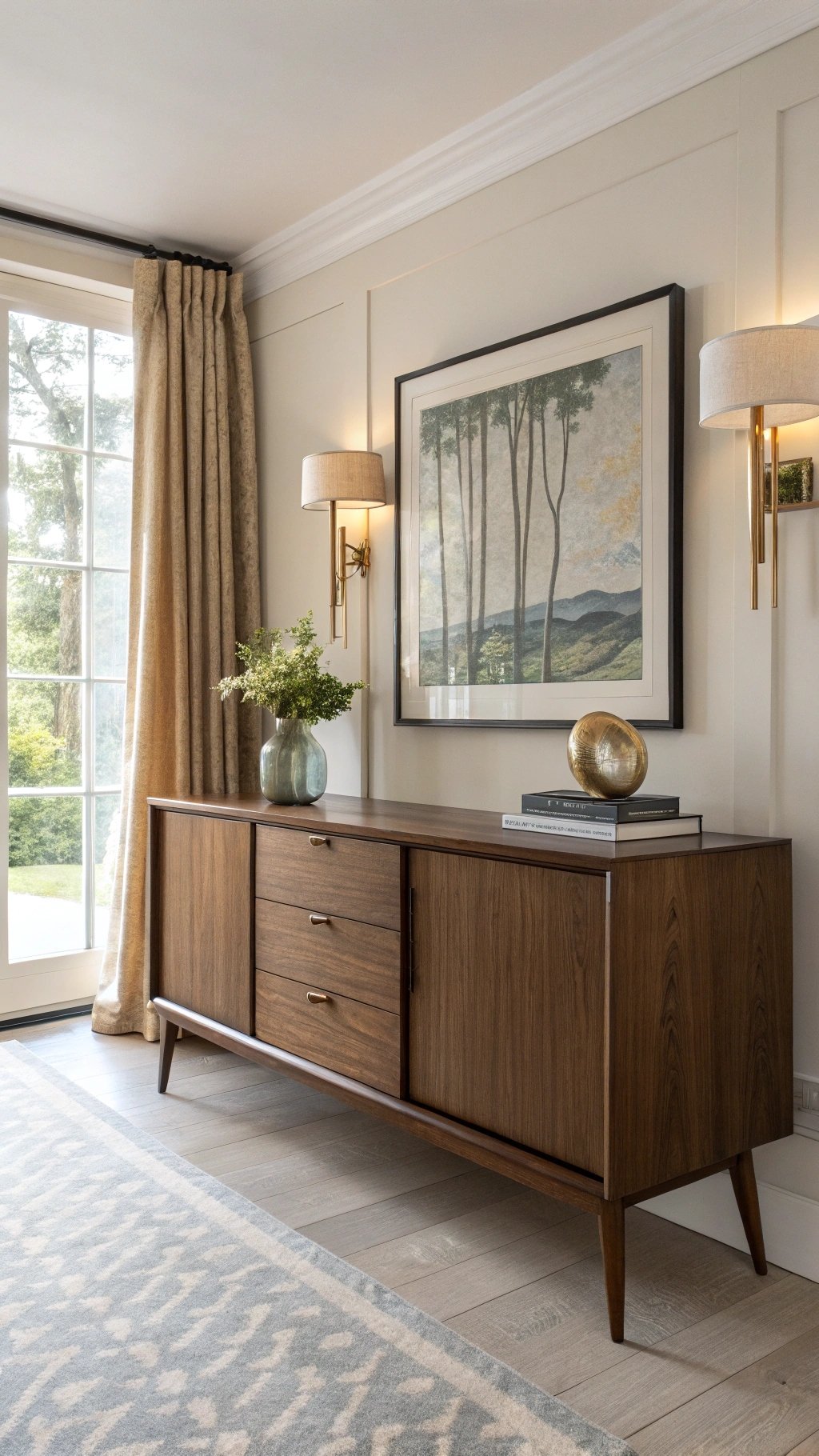 A low, long credenza organizes tech while delivering mid-century lines. Look for sliding doors, finger pulls, and interior cord management.