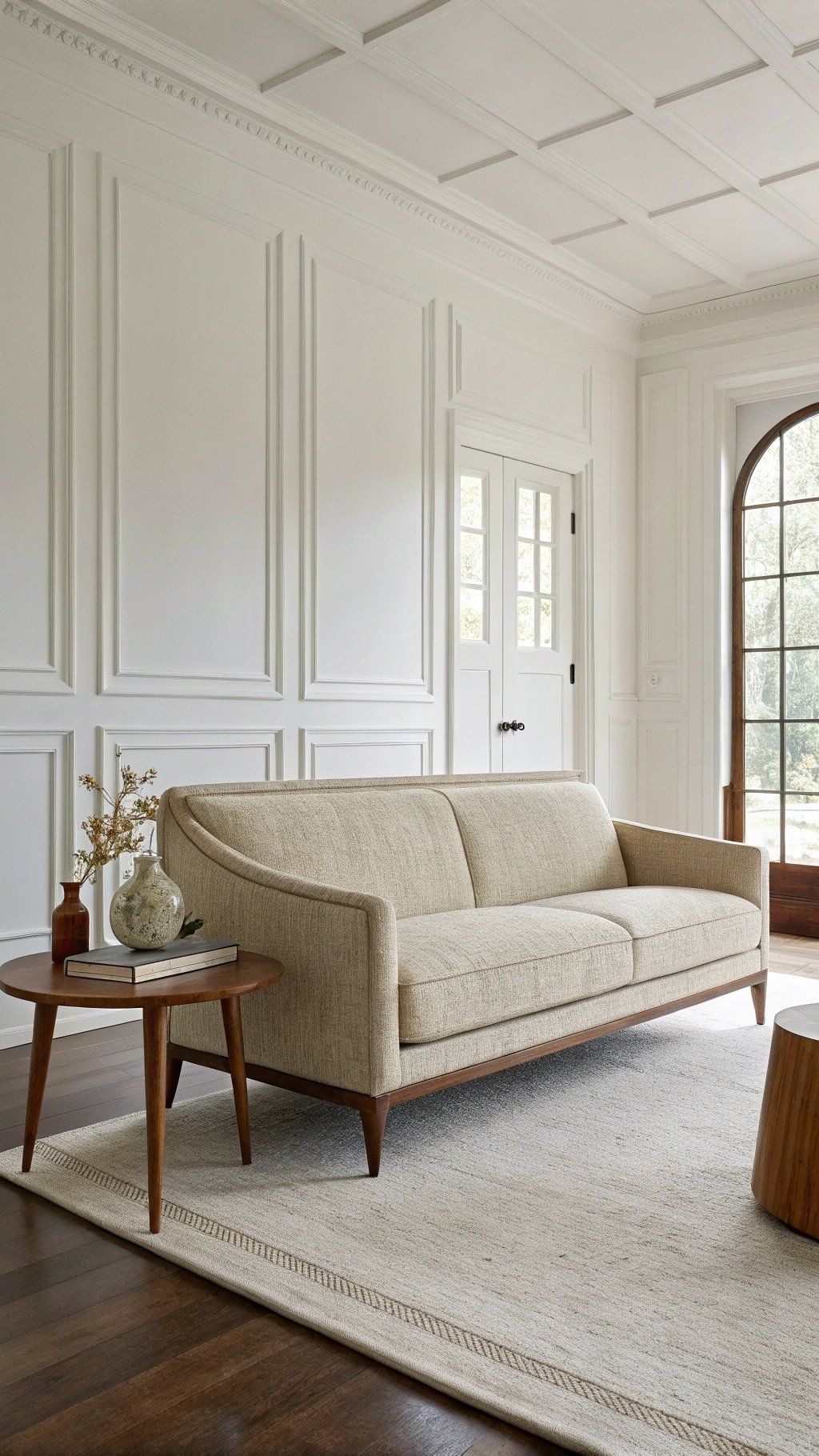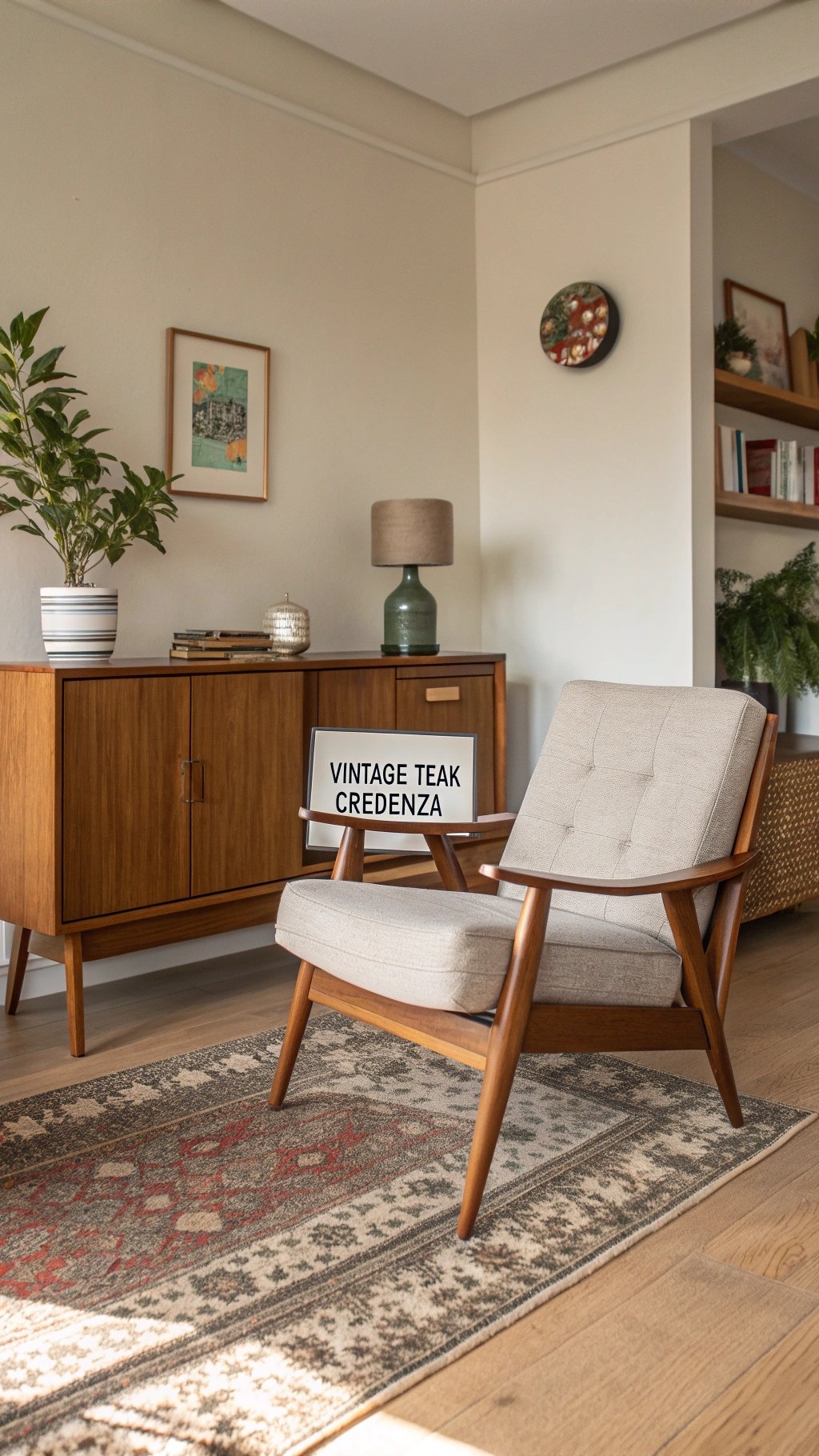 Mid-century rooms revolve around warm wood. Anchor the space with a walnut coffee table, teak credenza, or slatted paneling.