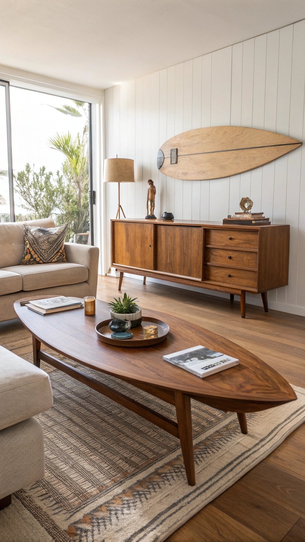 Swap heavy rectangles for a biomorphic surfboard or triangular boomerang table. These organic shapes invite flow around the seating group and feel period-correct without shouting.