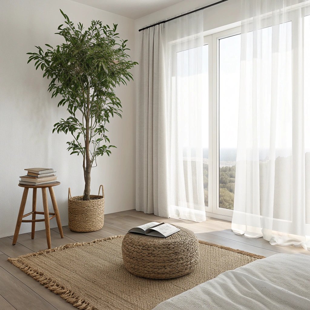 Layer window treatments—sheer Roman inside, full-length curtain outside—for depth without bulk. Keep the color story tight and let one natural material (oak or linen) repeat. The result feels tailored, not cramped.