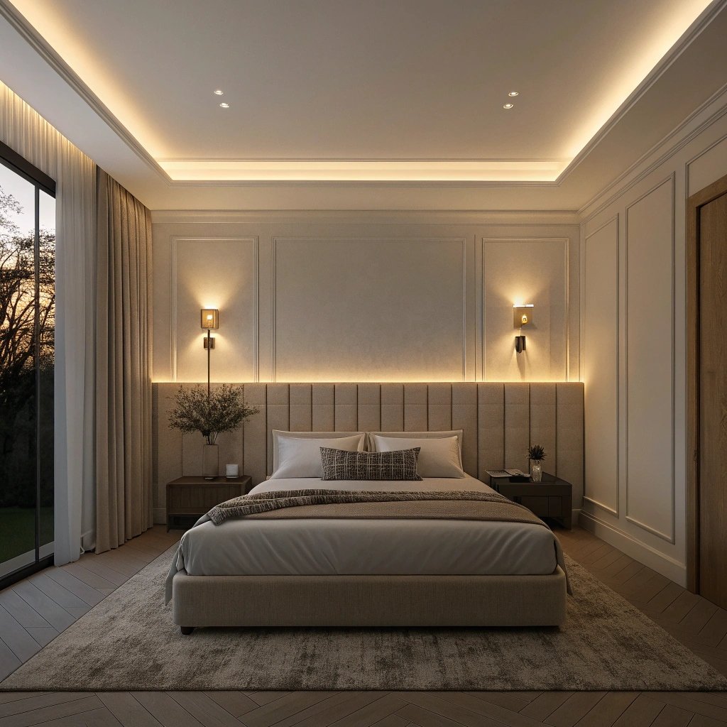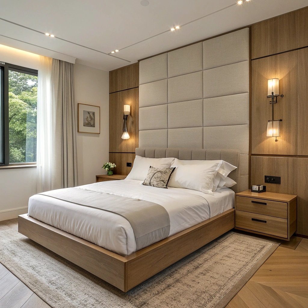 Color-match the headboard to the wall within one tone for a tailored, near-built-in effect. Add backlighting that grazes up the wall to lift the ceiling line visually.
