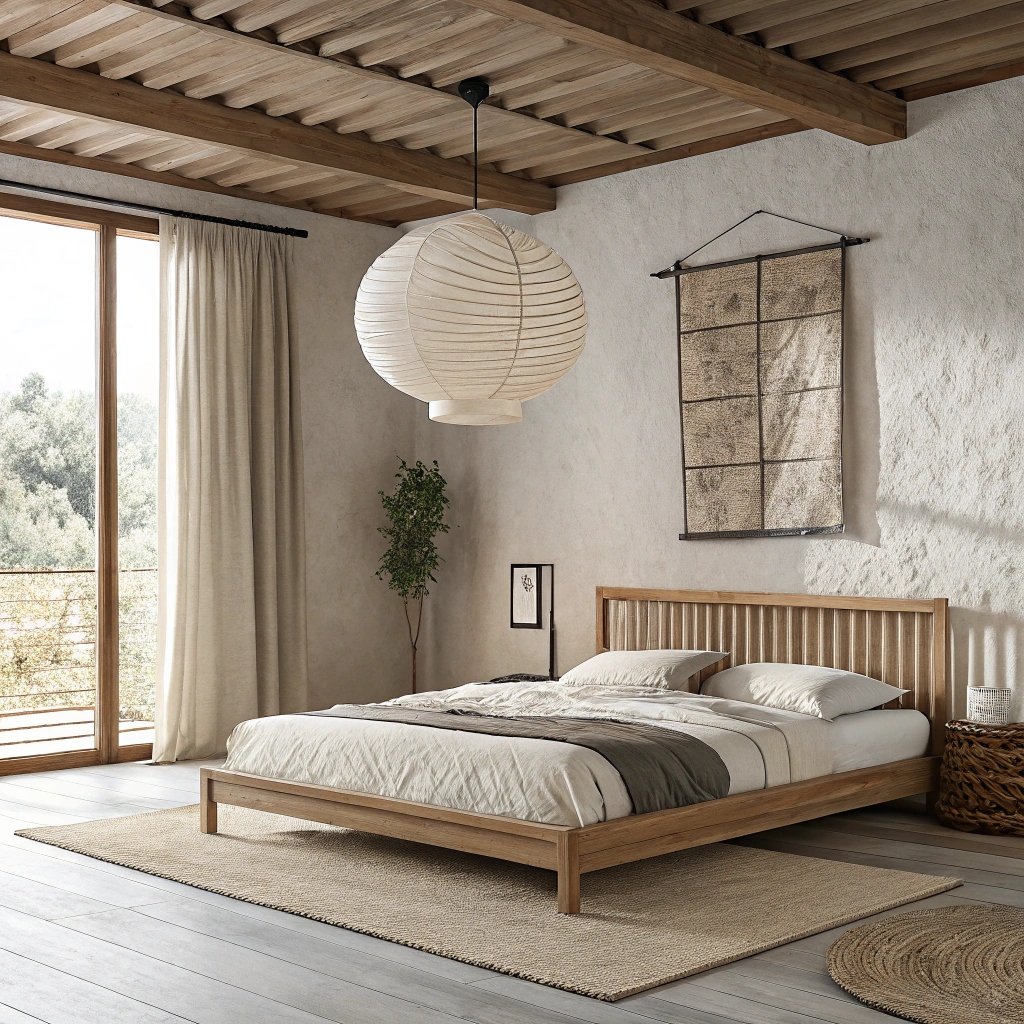 Blend Japanese restraint with Scandinavian warmth: low platform bed, pale wood nightstands, and gauzy linen curtains that skim the floor.