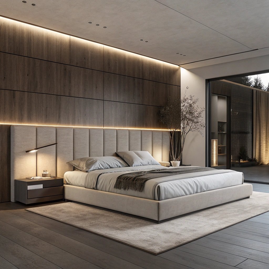 A low bed visually expands tight rooms. Pair it with an oversized headboard—channel-tufted, paneled wood, or upholstered slab—to anchor the wall without extra furniture.