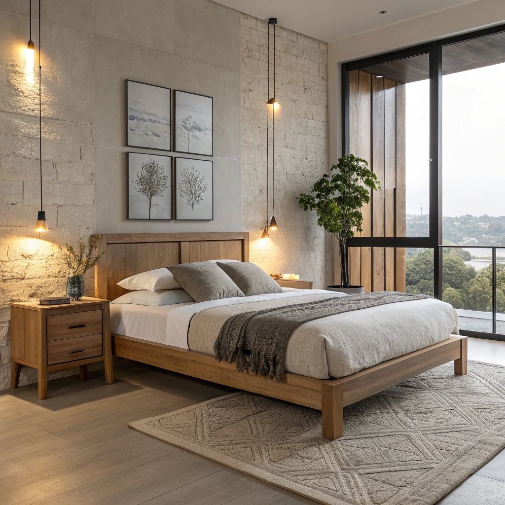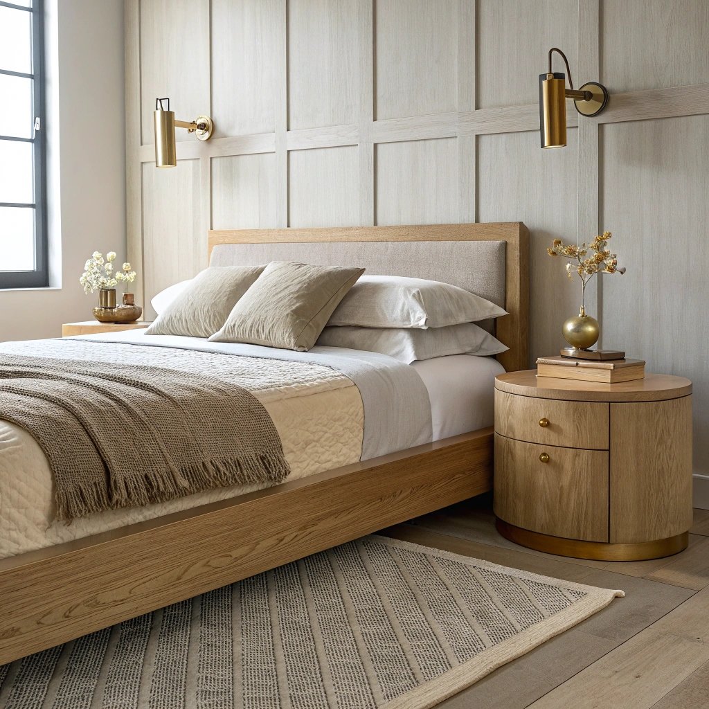 Let materials tell the story: a stone-topped night table, oak bed, and brushed-brass reading lights. Patterns are absent; grain and veining supply interest that ages gracefully. The palette stays neutral and warm.