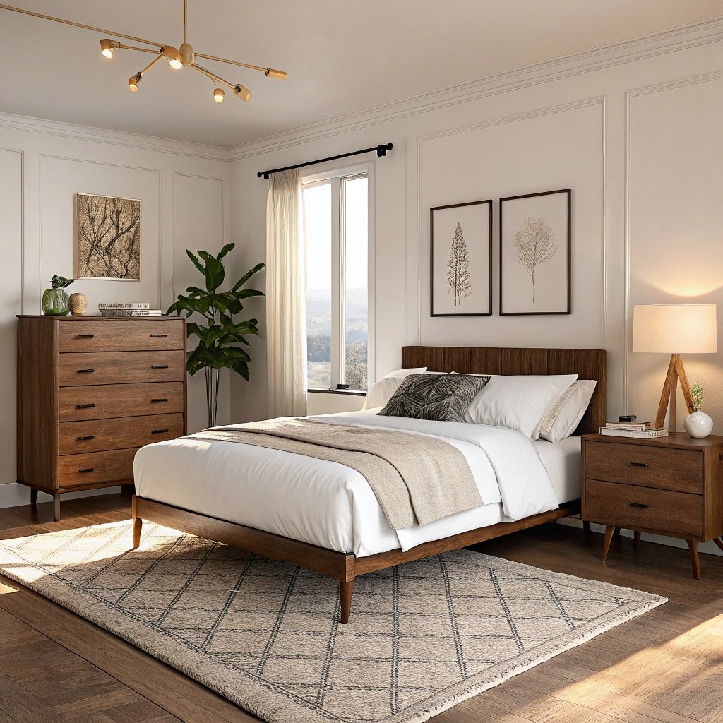 Repeat materials across the room deliberately: oak bed, oak bench, iron lamp base. A single vintage rug in a muted palette adds history without breaking minimal rules.