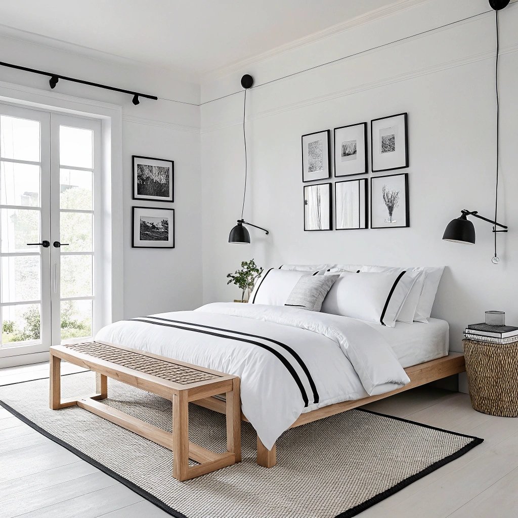 High-contrast minimalism sharpens lines and simplifies choices. Keep walls bright white, introduce a thin black frame around the mirror and art, and use matte black for hardware and lamps.