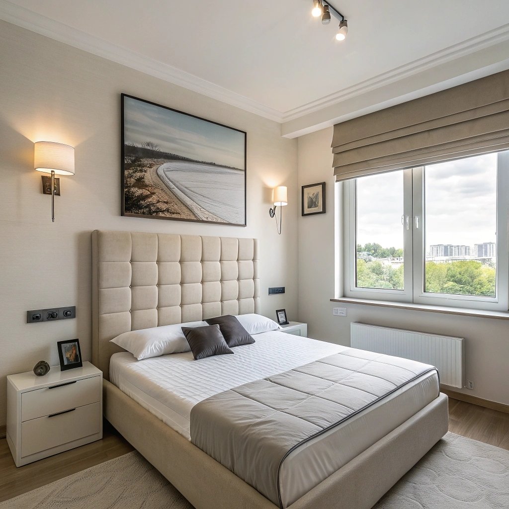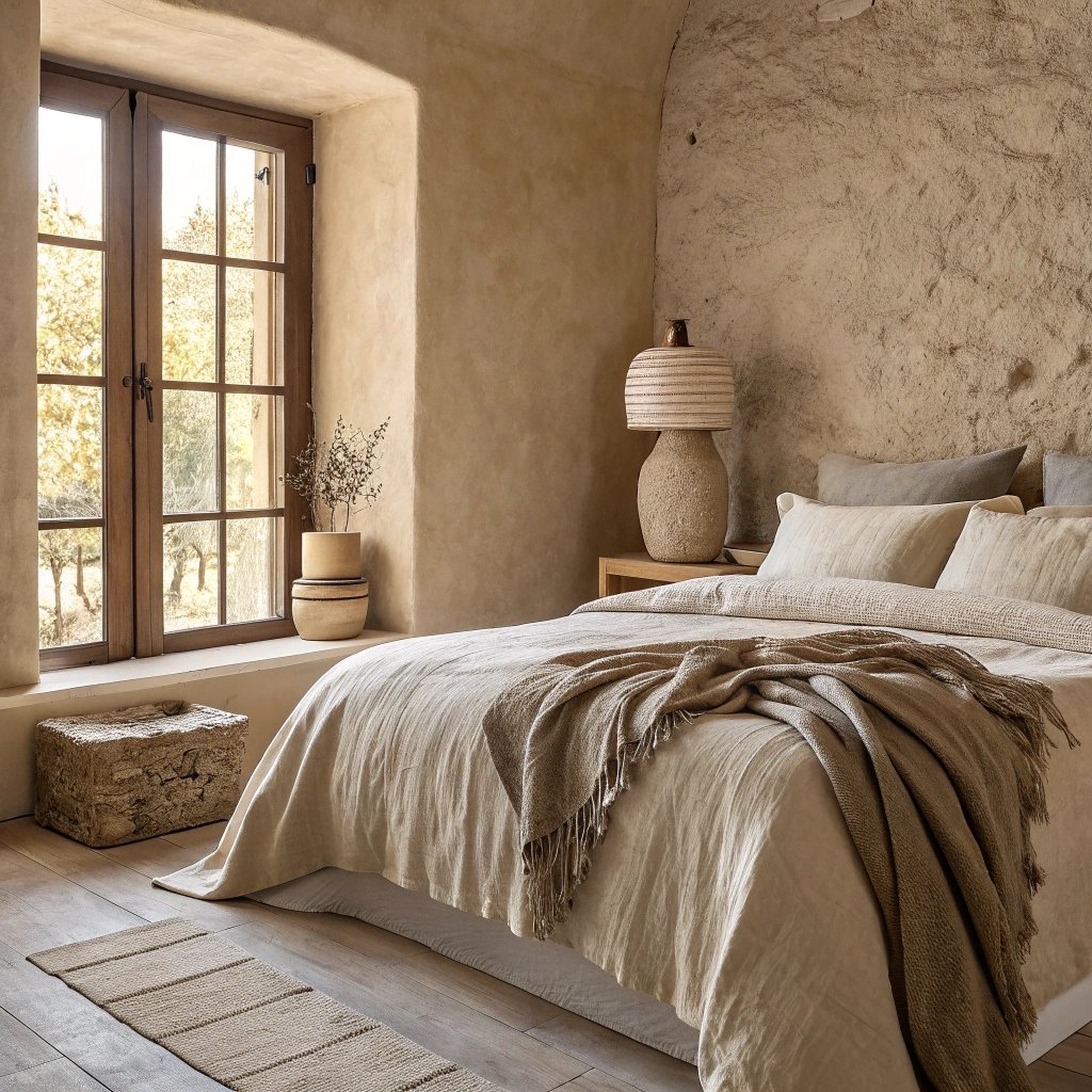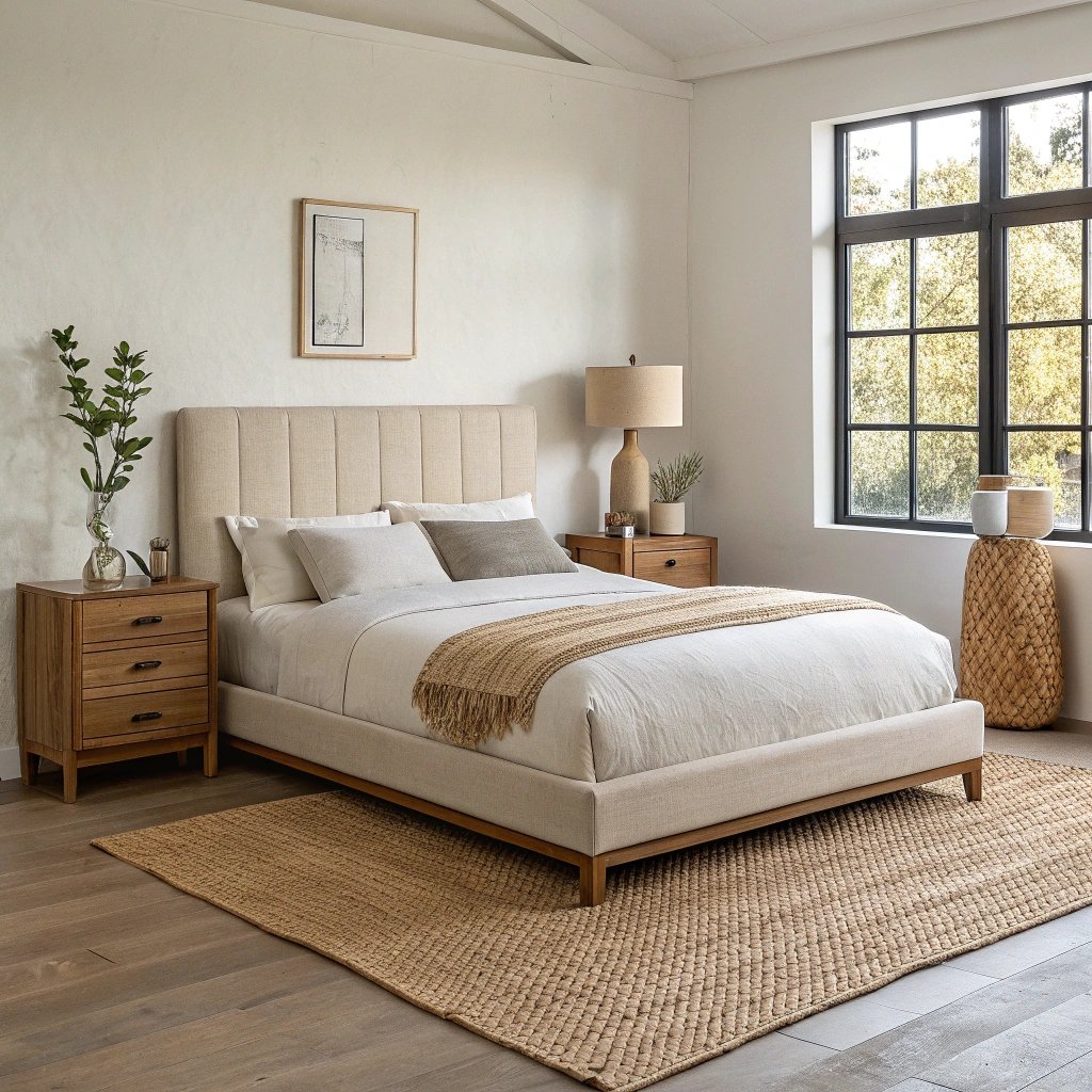 Keep the palette intentionally narrow—bone, oat, and warm white—so the eye relaxes. Start with a padded headboard, crisp linen sheets, and a wool or jute rug sized to frame the bed.