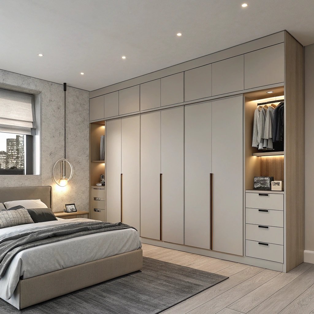 Turn one wall into a calm plane with floor-to-ceiling wardrobes and integrated pulls. Inside, double-hang rails, drawer dividers, and a tray for accessories make a dresser optional. The facade color-matched to walls reads like architecture, not storage.