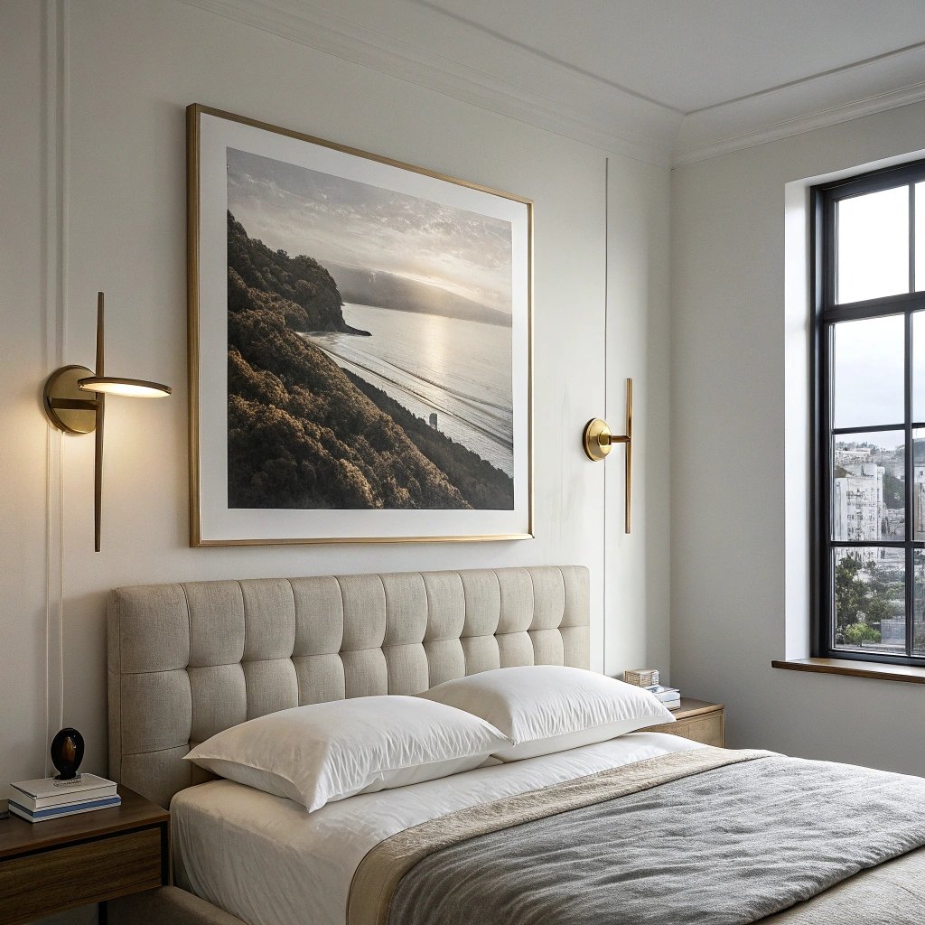 Use a micro-bezel frame in a material that echoes another element—brass picture light with brass lamp finials, for instance. A wide, creamy mat gives breathing room.