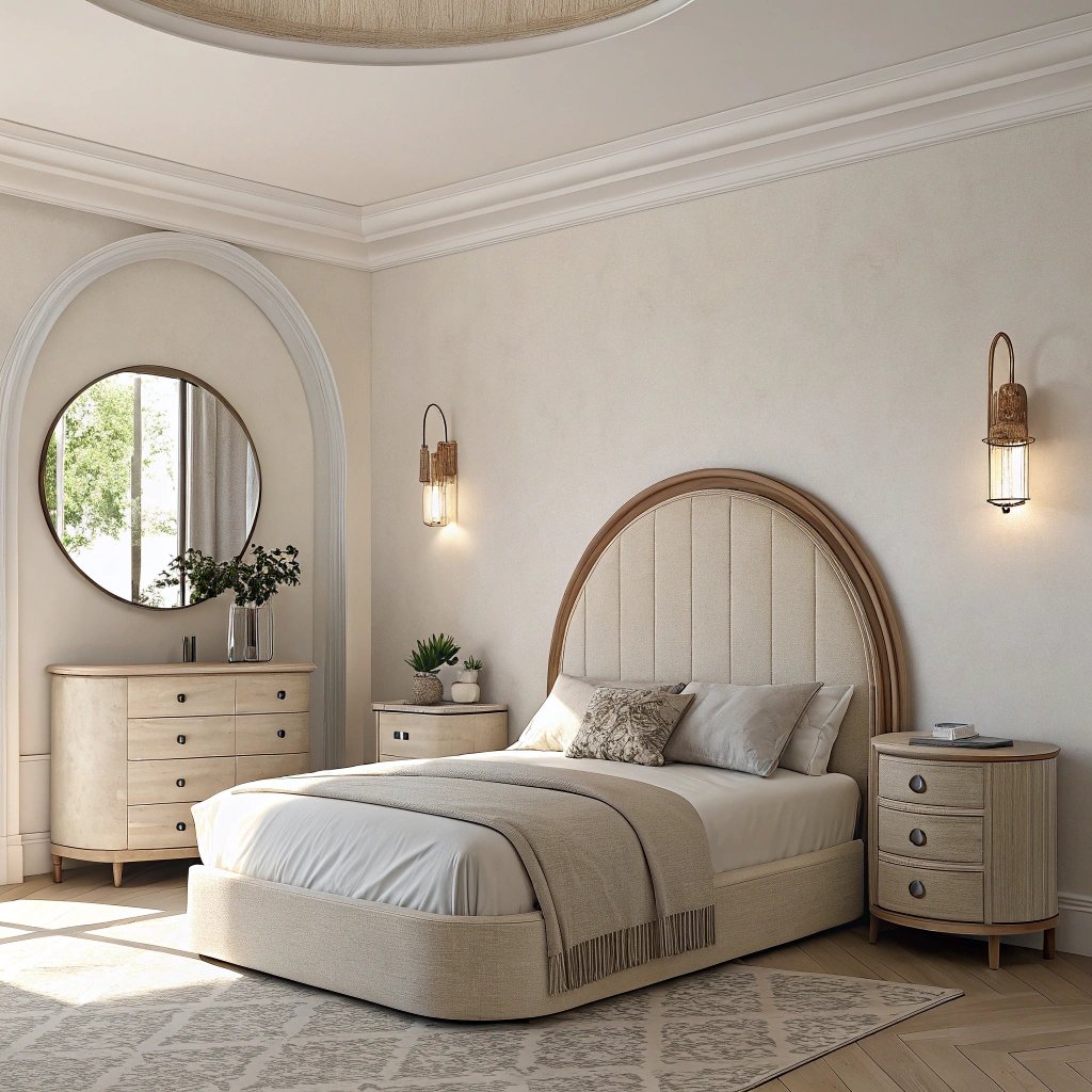 Swap sharp edges for rounded forms—arched headboard, oval mirror, bullnose shelf. Curves reduce visual tension and make small rooms feel gentler.