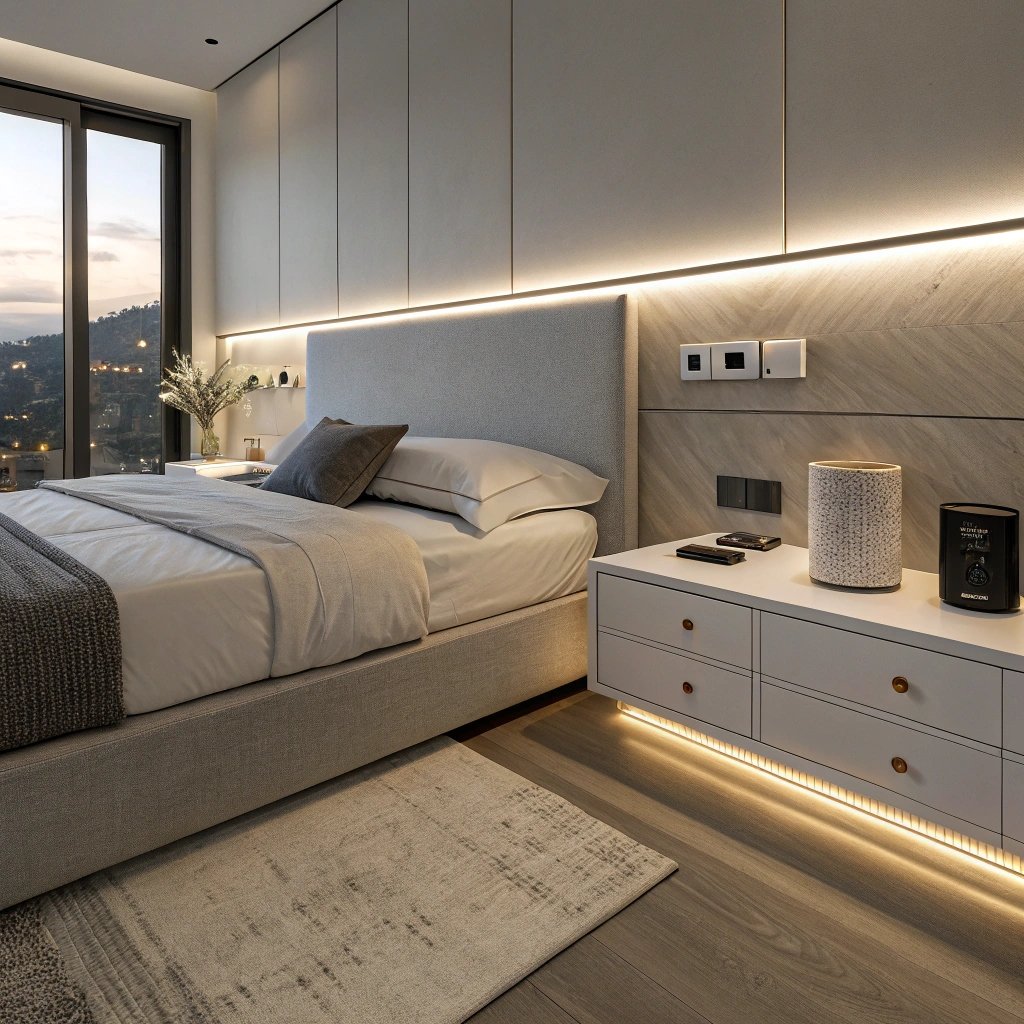 Use a headboard panel to hide outlets and chargers, with a magnet catch for easy access. A tunable bedside lamp shifts from 4000K task to 2700K wind-down, supporting circadian rhythm while staying invisible in the design.