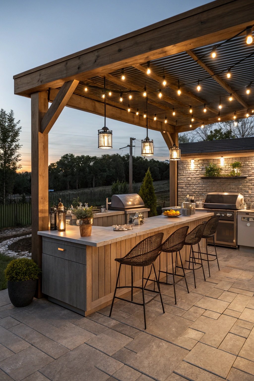 A cedar pergola frames a full kitchen with island seating for five, pendant lights, and a back wall hosting grill, sink, and storage. Porcelain pavers run underfoot for easy cleaning.