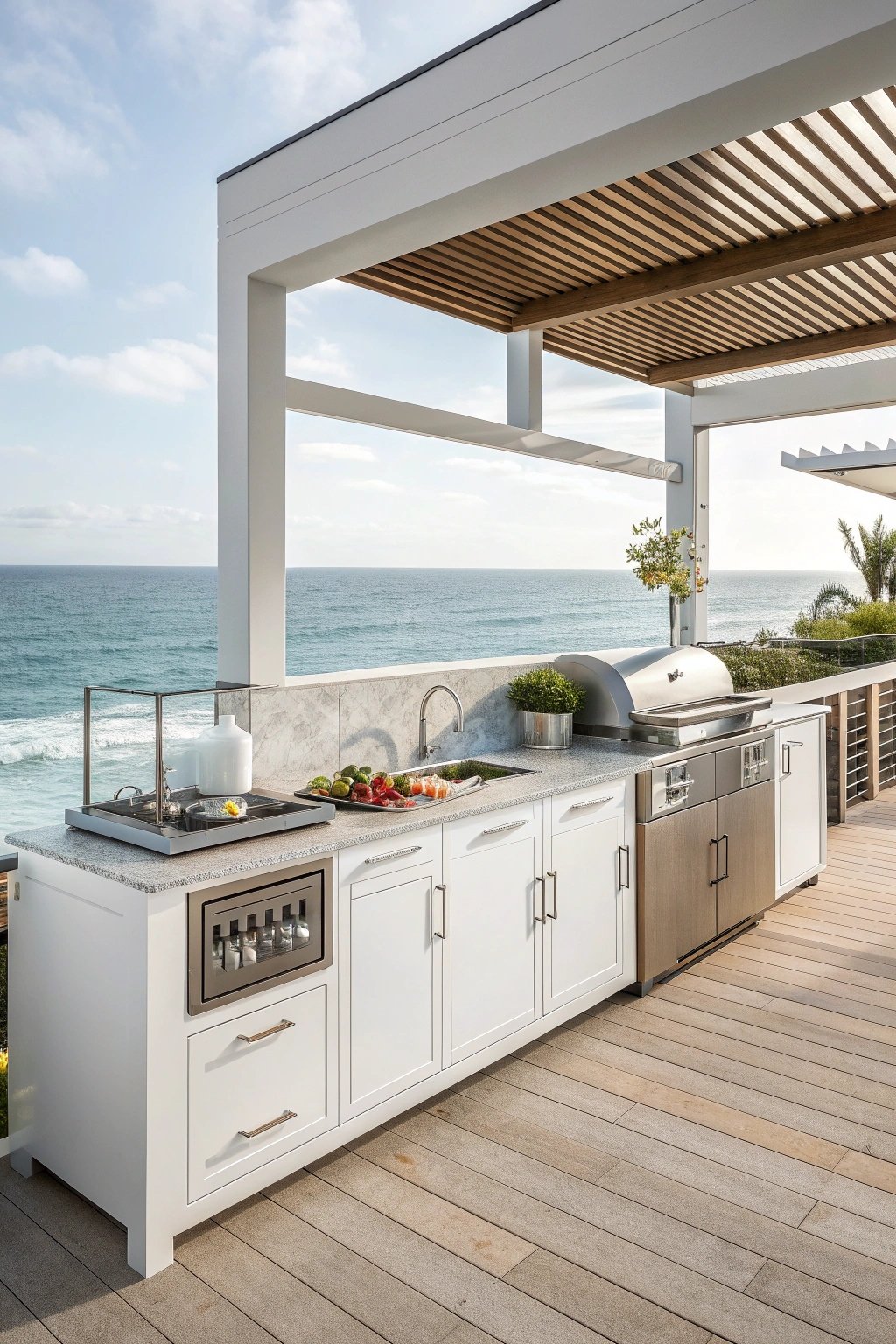 A louvered back panel promotes airflow and prevents corrosion. A drop-in cooler for ice, a rinsing station for shellfish, and anti-slip decking keep seaside cooking practical and safe, even on breezy days.
