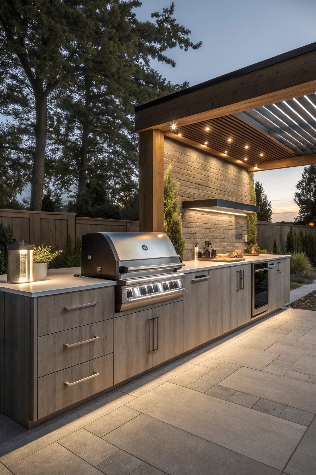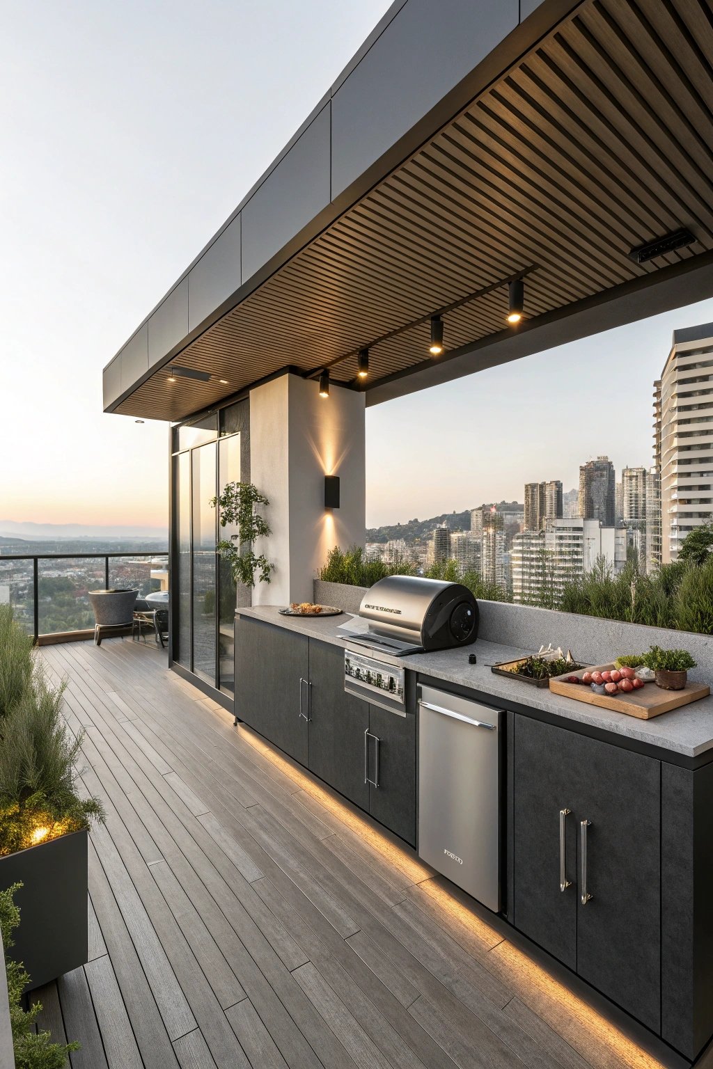 Small footprints can still deliver a full outdoor cooking experience. A linear run along a balcony wall—with a slim built-in grill, under-counter fridge, and folding prep shelf—keeps everything within reach.