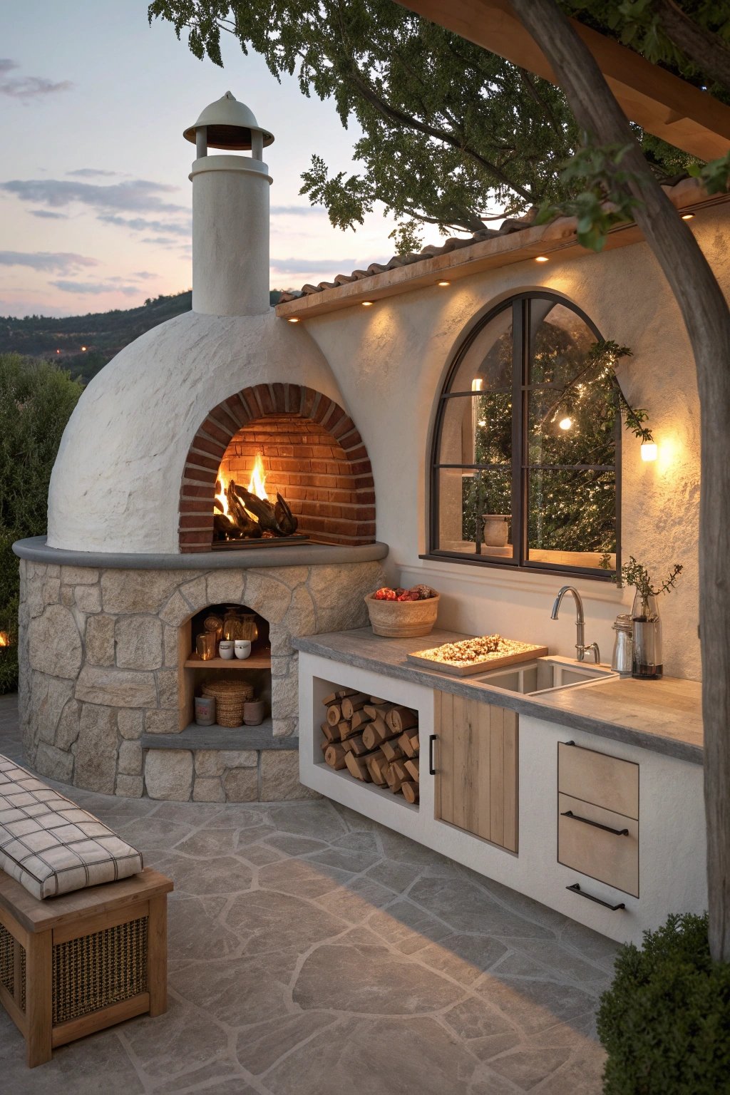 A domed wood-fired oven centers a cozy masonry alcove with a dedicated prep counter, peel rack, and proofing drawer. Adjacent shelves hold flour bins and spices.