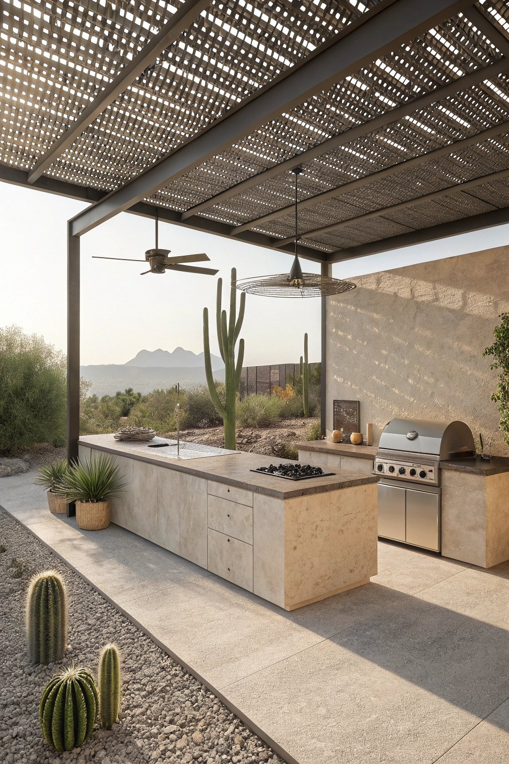 In hot, arid climates, shade and airflow are everything. A perforated metal canopy and breeze-block wall temper sun and wind. Light-colored Dekton-style counters reflect heat, and induction plus a ceramic grill reduce open flame.
