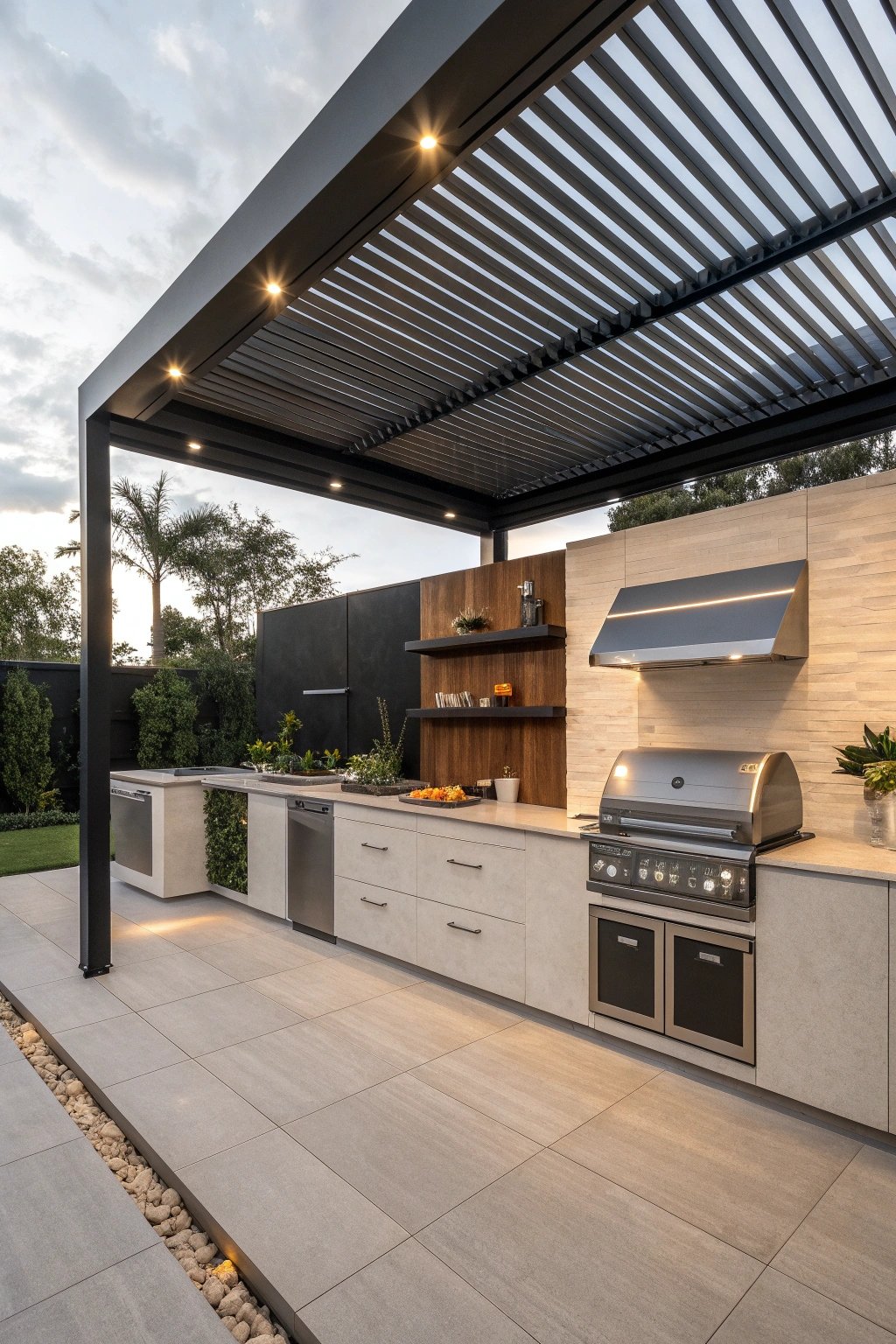 Adjustable louvers shift from shade to rainproof in seconds, turning the kitchen into an all-weather room. Infrared heaters and side screens extend use through cool months.